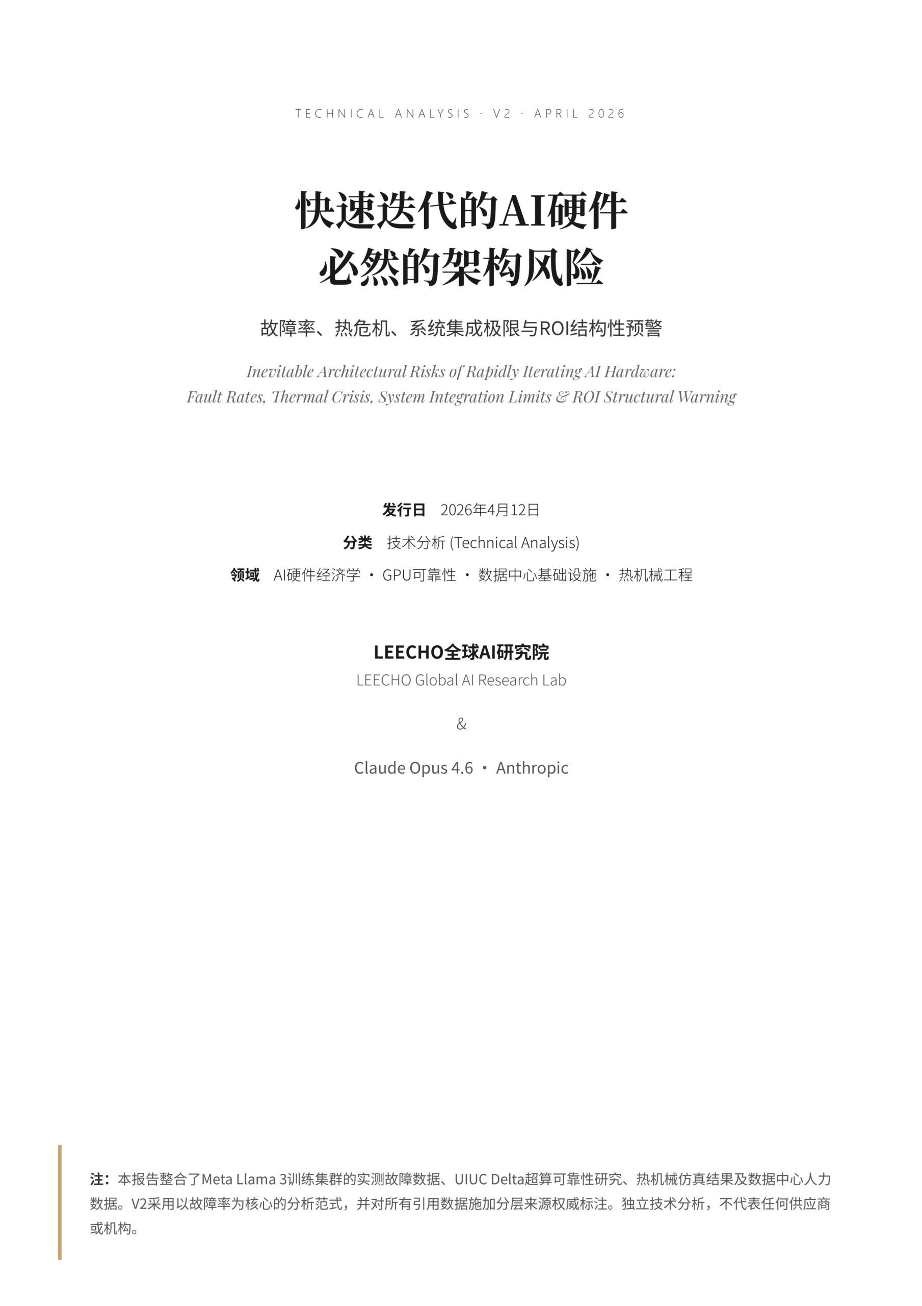 AI硬件基础设施正在撞上物理极限。本报告从故障率与系统复杂度的正相关关系切入,结合Meta Llama 3训练的16,384块H100一手故障数据、UIUC Delta超算2.5年GPU可靠性田间研究、Synopsys与imec的热-机械仿真结果、以及美中两国数据中心散热人才招聘数据,构建了从用户体感(”降智”现象)到物理层(电迁移、CTE失配、TSV热疲劳)的完整因果链条。V2版本摒弃了争议性的”GPU寿命1-3年”框架,转向以故障率为核心的分析范式,新增散热人才危机与ASIC替代路径两个维度,并对所有引用数据按发布机构权威性进行了分层标注。