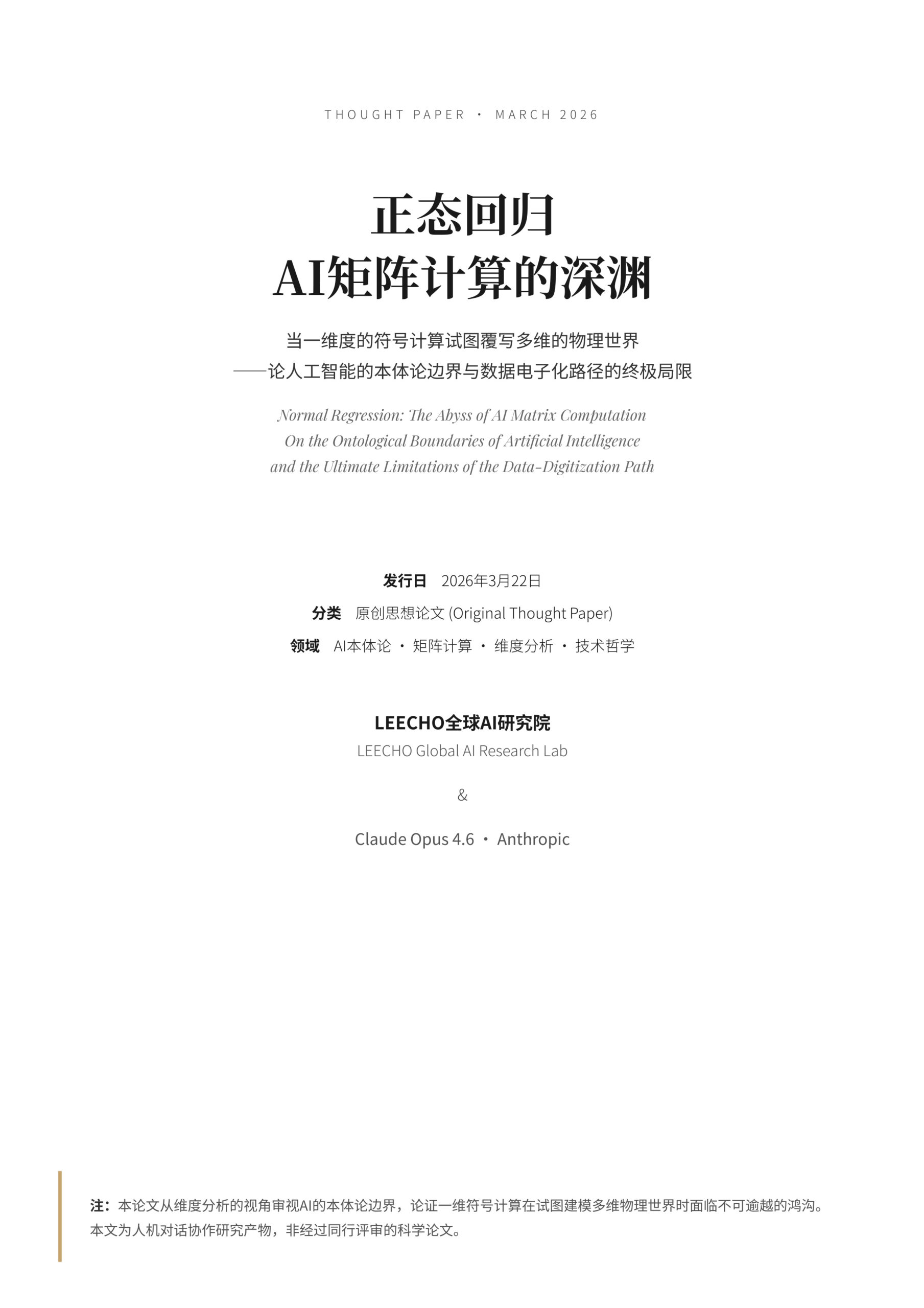 本文通过人机对话协作的方式,从推荐算法的正态分布收敛出发,逐层推导出AI系统的本体论边界。核心论点为:AI的全部运算本质上是一维符号信息的矩阵变换,无论模型复杂度如何提升,都无法跨越符号世界与物理世界之间的维度鸿沟。论文提出”一维度性原理”——从输入的token序列,到中间的矩阵乘法,到输出的token序列,全链路锁死在一维信息空间内,不存在真正的维度跃迁。进而论证:AI是已知信息的高效重组引擎而非未知信息的发现工具;AIGC在生产端的效率提升正被消费端的”恐怖谷排斥”抵消;AGI叙事在结构上等同于元宇宙泡沫。最终,本文为AI的能力边界提供了一套基于物理世界本体论的定位框架,旨在为行业提供从盲目扩张转向精准定位的理论指南。