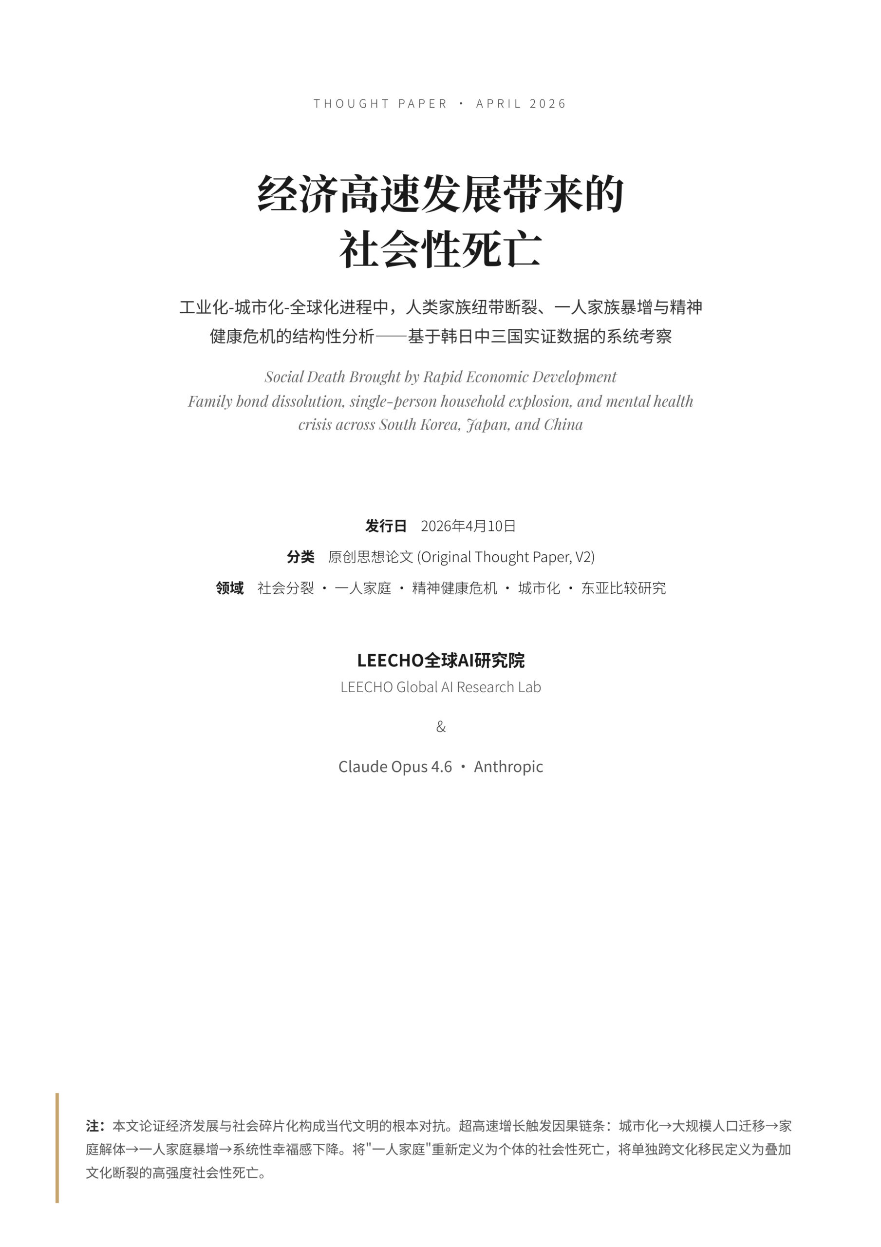 本文提出并论证一个核心命题:经济发展与社会割裂是人类当下的一种核心对抗关系。通过系统梳理韩日中三国在超高速经济增长期间的家庭结构变迁、一人户比例演变、自杀率走势、孤独死统计及精神疾病流行病学数据,本文揭示了一条清晰的因果链条:超高速经济发展→高速城市化→人口大规模移动→家庭割裂→一人家族暴增→幸福感系统性下降→自杀率攀升与精神疾病社会化。进而指出,”一人家族”本质上是个体的社会性死亡,而跨文化的单人移民则是叠加了文化剥离的更高烈度社会性死亡。二者均为工业化-城市化-全球化经济模式的结构性伴生品,构成了一场史无前例的人类物种适应性危机。