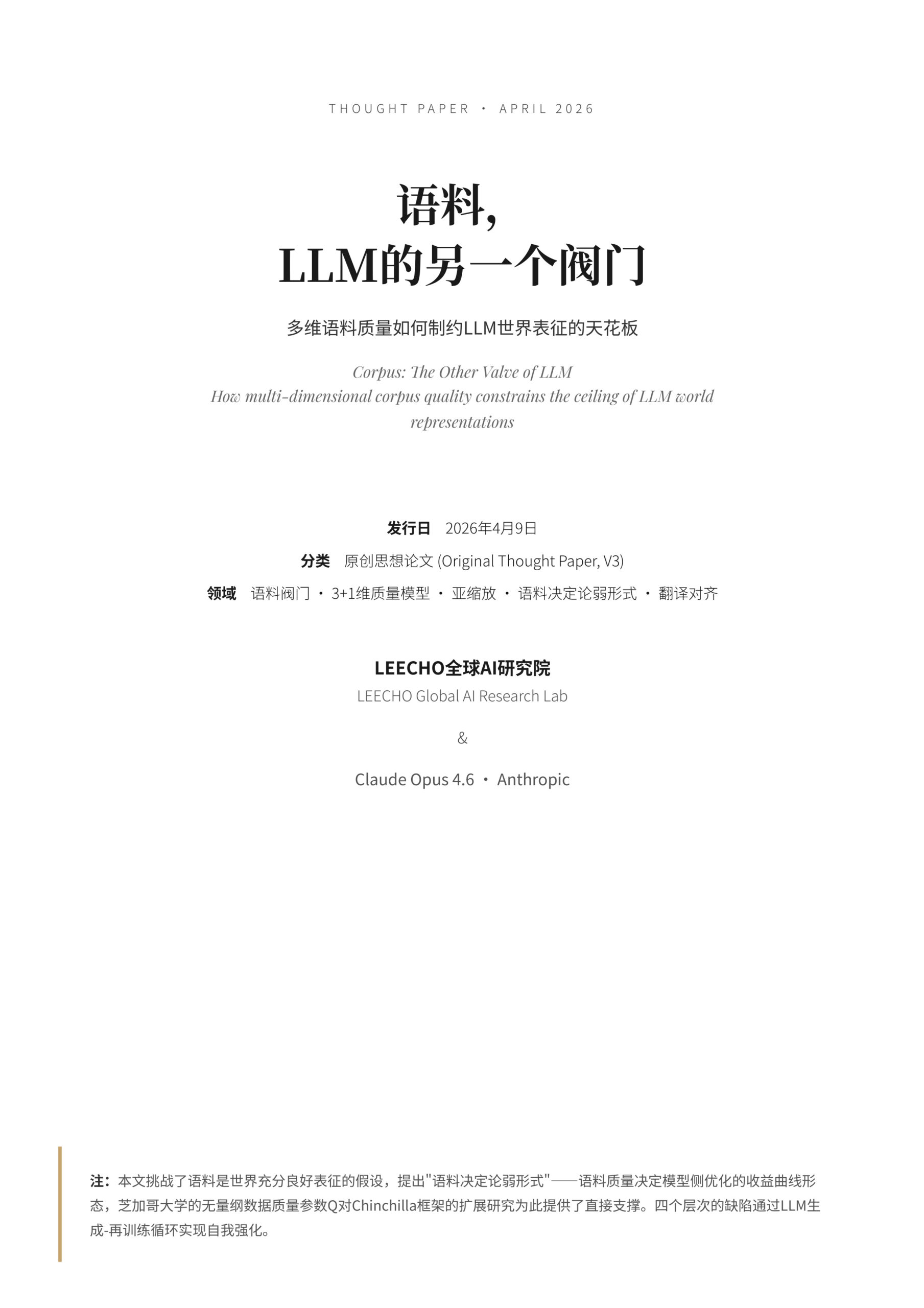 芯片是LLM的算力基础设施,模型架构是LLM的计算基础设施,而语料是LLM的认知基础设施。当前的缩放困境——预训练收益递减、高质量数据枯竭——其本质不是数据量的耗尽,而是语料多维质量的结构性欠账。”语料阀门”是理解这一困境的关键概念:它不是一道墙,而是一个调节模型端优化收益曲线坡度的旋钮。识别并修复这个旋钮的每一个维度——语义精度、语域纯度、数据卫生、翻译对齐——才能重新打开缩放的空间。