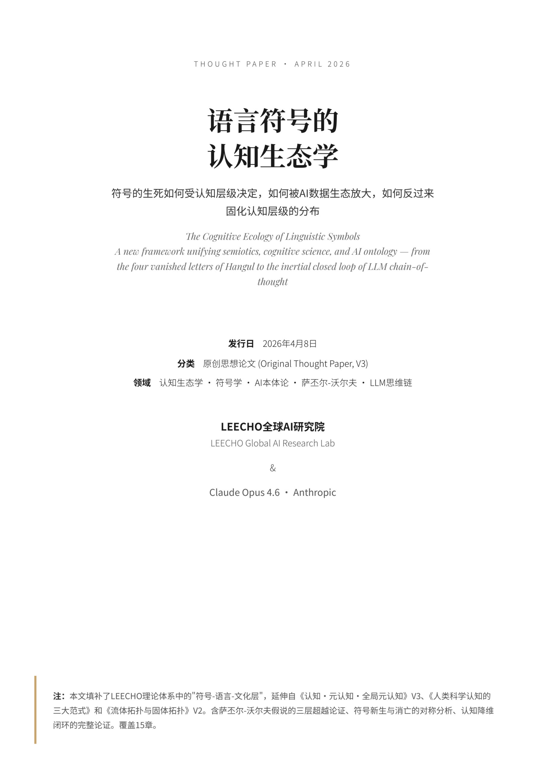 本文填补了LEECHO研究院已有理论体系中的”符号-语言-文化层”空白:《认知·元认知·全局元认知》V3提供了认知结构层面的层级理论,《人类科学认知的三大范式》提供了方法论层面的框架,《流体拓扑与固体拓扑》V2提供了物理层面的约束论证。本文作为第四篇,连接了前三篇之间的缺失环节——语言符号系统的生死动态如何参与认知固化闭环的形成。