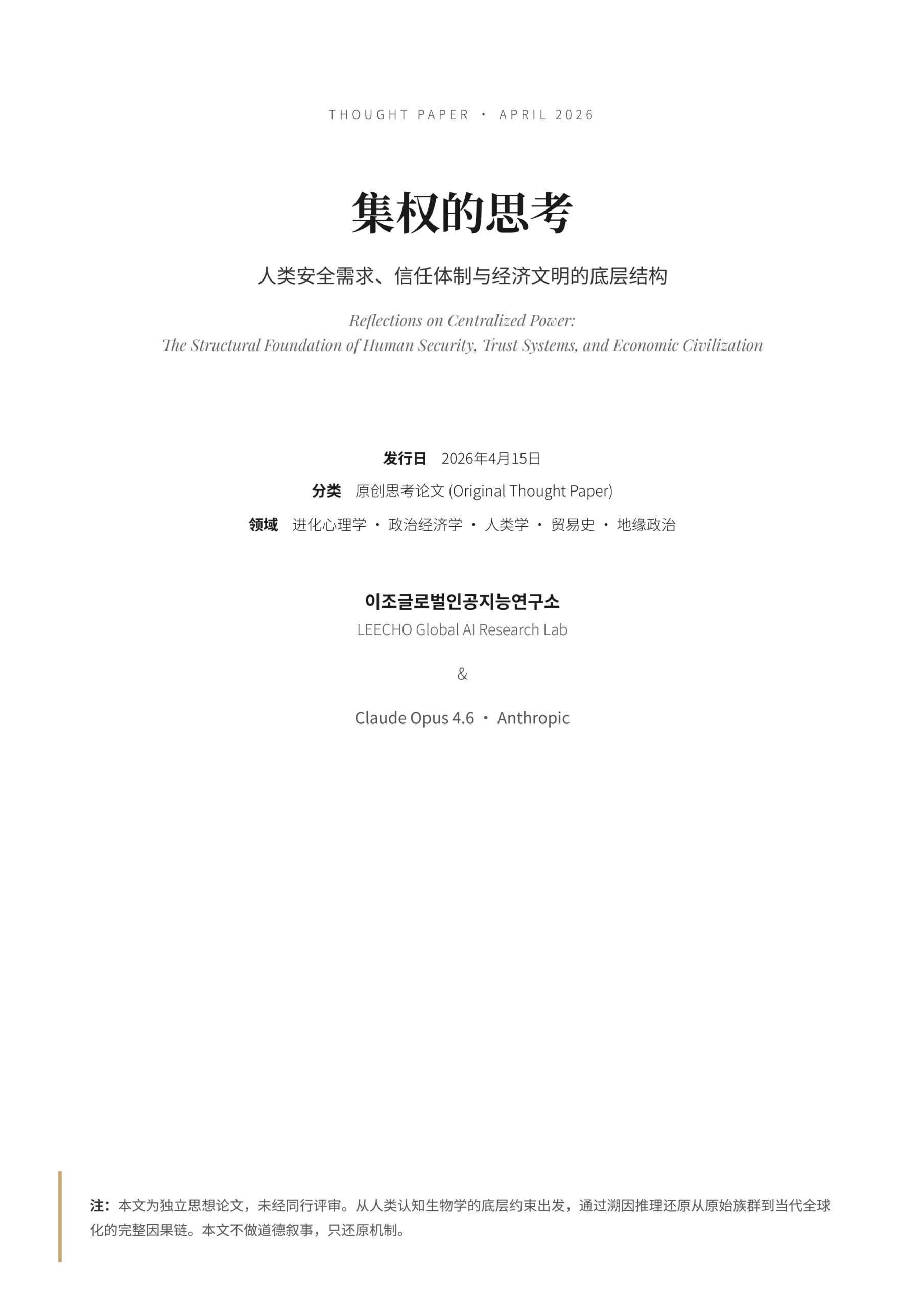 本文为独立思考论文,未经同行评审。内容旨在通过溯因推理还原人类社会组织的底层结构逻辑,不代表对任何政治制度的价值判断或政策倡导。所有历史分析均基于考古记录、人口统计数据、学术研究和公开资料。第14章(二八法则)为基于需求层次理论的结构性假说,非实证结论。