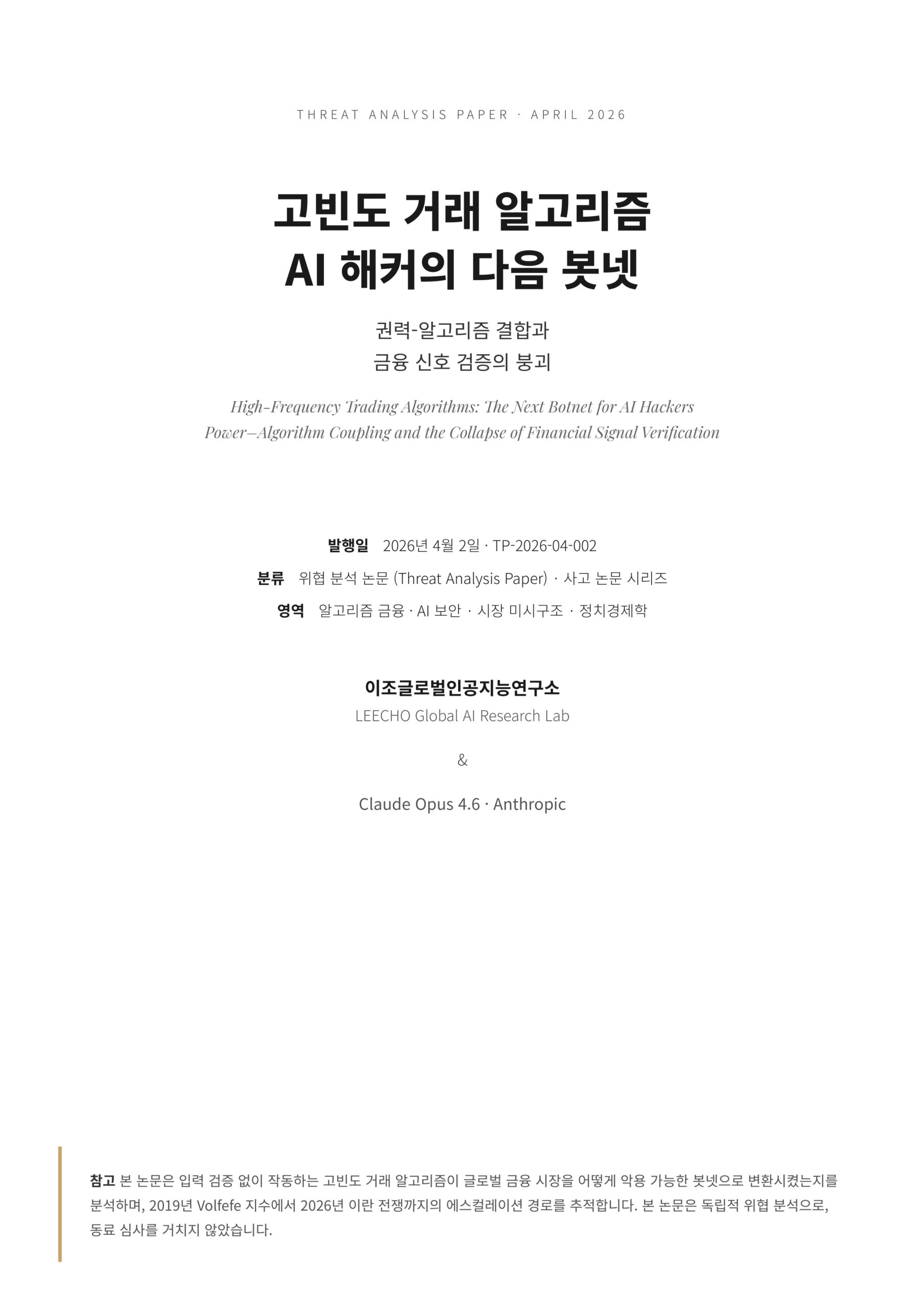 본 논문은 제5의 차원을 추가한다: 권력-알고리즘 결합. 2019년 JP모건 Volfefe 지수 → 2025년 TACO(Trump Always Chickens Out) 거래 패턴 → 2026년 4월 1일 이란 전쟁 전국 연설의 에스컬레이션 경로를 추적하여, 금융 알고리즘이 7년간 미국 대통령을 “다수의 시장 참여자 중 하나”에서 “금융 정보 공급망의 단일 신호원”으로 재코딩한 과정을 논증한다. 트럼프는 같은 19분 연설에서 “전쟁이 거의 끝났다”와 “석기시대로 폭격하겠다”라는 두 개의 상호 모순되는 신호를 동시에 발신했고, 글로벌 시장은 양쪽 방향 모두에서 거래를 실행했다 — 이것은 정상적인 가격 발견도 합리적인 위험 가격 산정도 아니다. 이것은 입력 검증이 없는 나체 시스템이 권력 신호에 보이는 조건반사다. 에너지 수입 의존도가 가장 높은 주요 시장인 한국의 KOSPI는 가장 극단적인 충격 증폭을 흡수하며, TACO 봇넷의 가장 참혹한 실증이 되었다.
