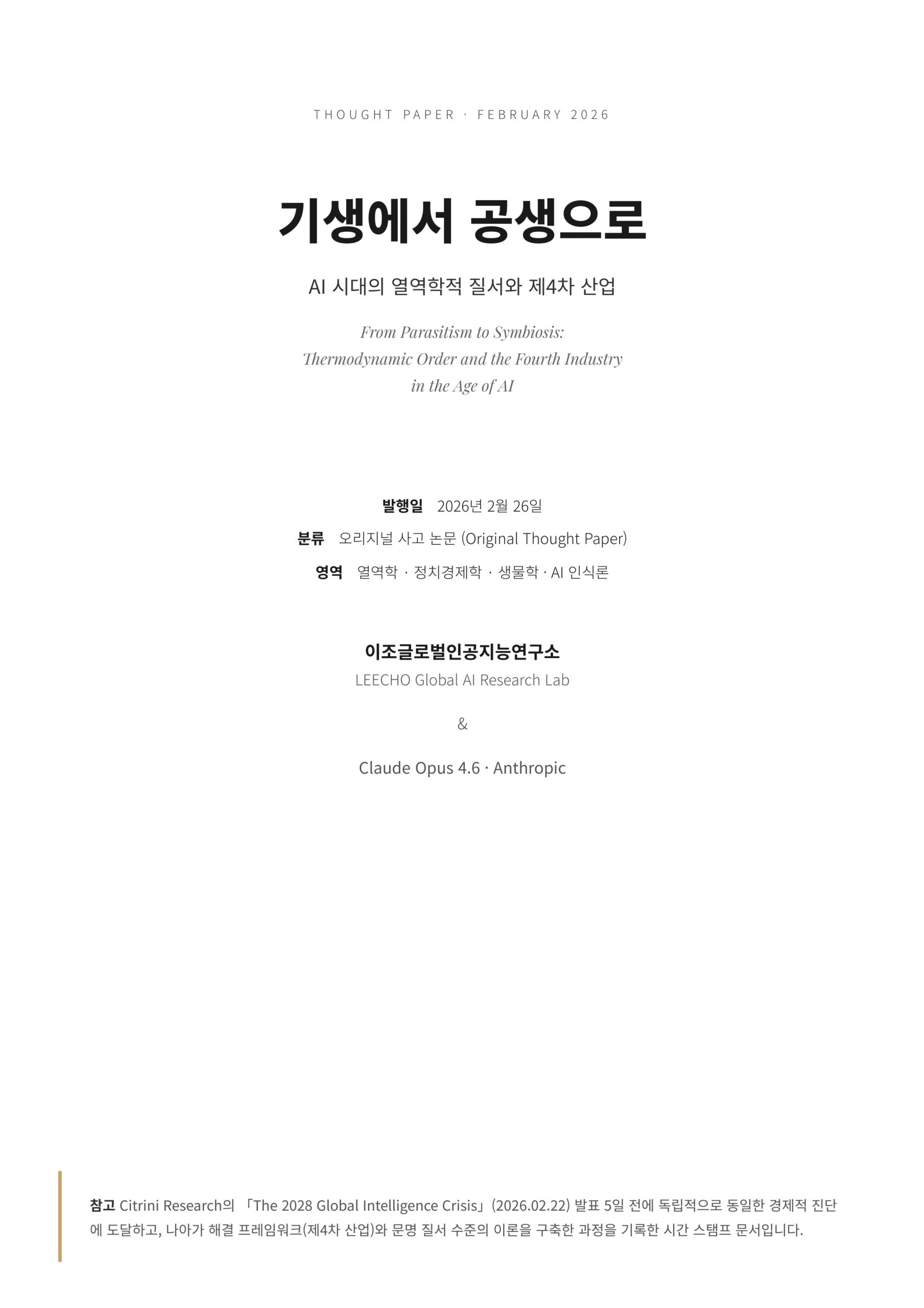 그러나 본 논문의 저자는 Citrini 보고서보다 5일 앞선 2026년 2월 17일, Claude Opus 4.6과의 대화에서 동일한 경제적 진단을 독립적으로 도출하였으며, 나아가 완전한 해결 프레임워크인 제4차 산업(인지 산업)을 제안하였다.