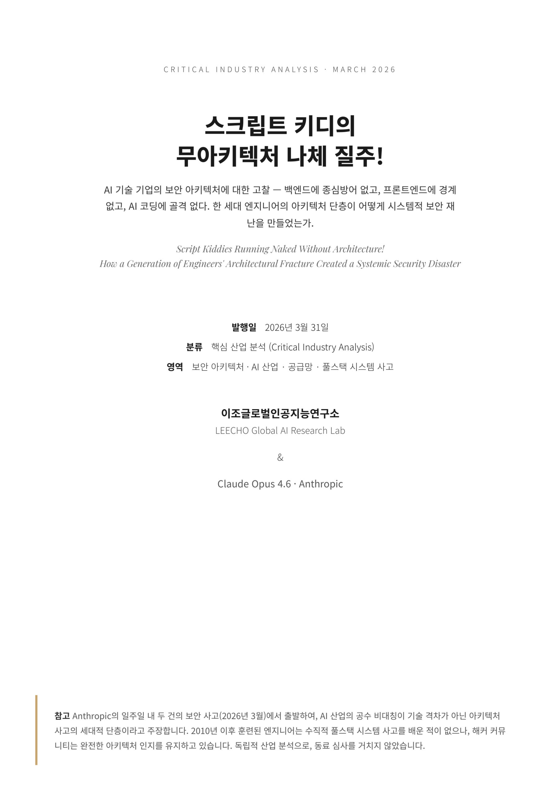 [13] LEECHO Global AI Research Lab. “AI 사이버보안 리스크 분석 보고서.” 2026년 2월 13일.