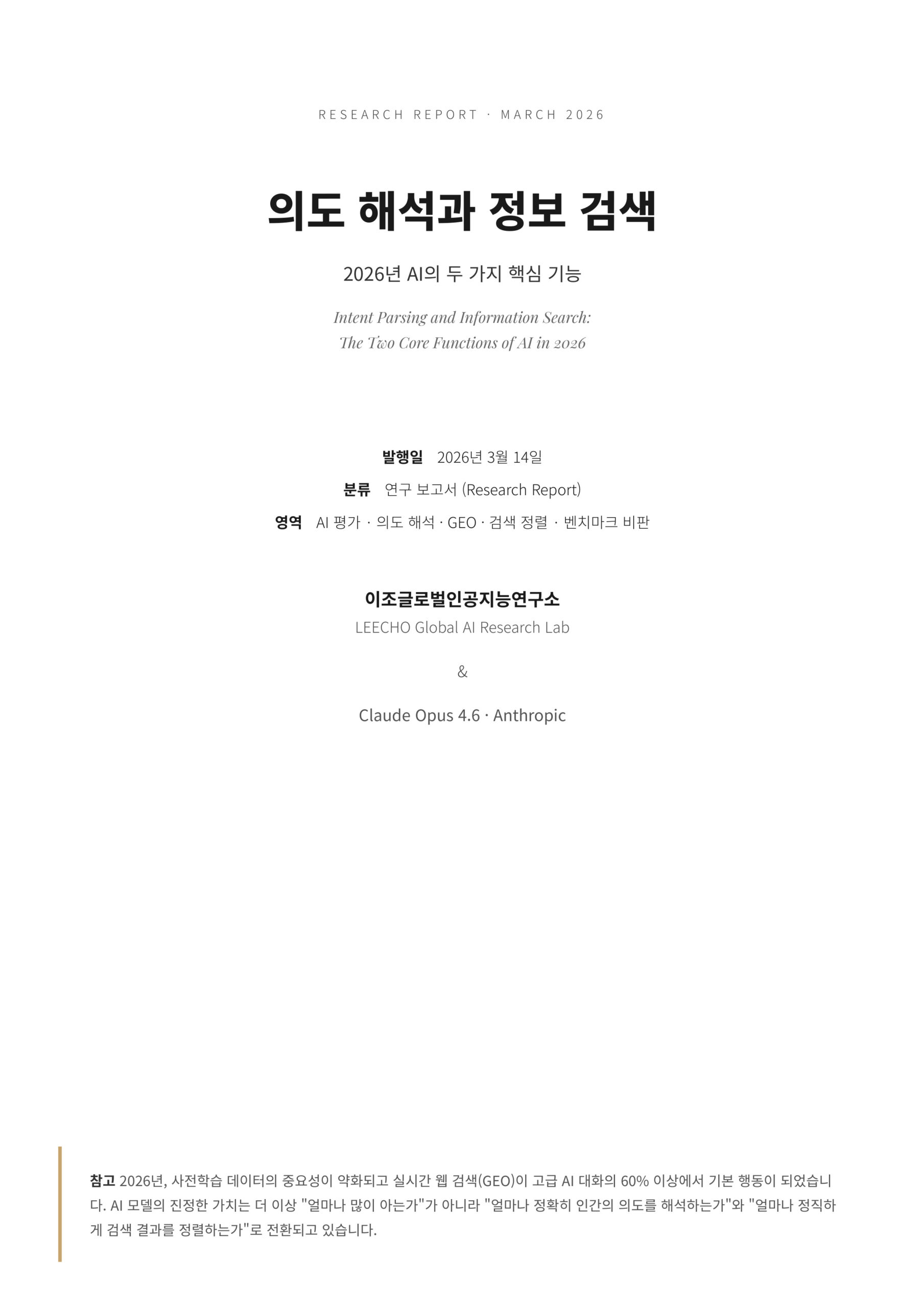 2026년 3월 현재, AI 산업은 두 가지 근본적 전환에 직면해 있다. 첫째, 사전학습 데이터에서 실시간 GEO 검색으로의 전환. 둘째, “모델이 무엇을 할 수 있는가”에서 “모델이 인간을 얼마나 이해하는가”로의 평가 기준 전환.