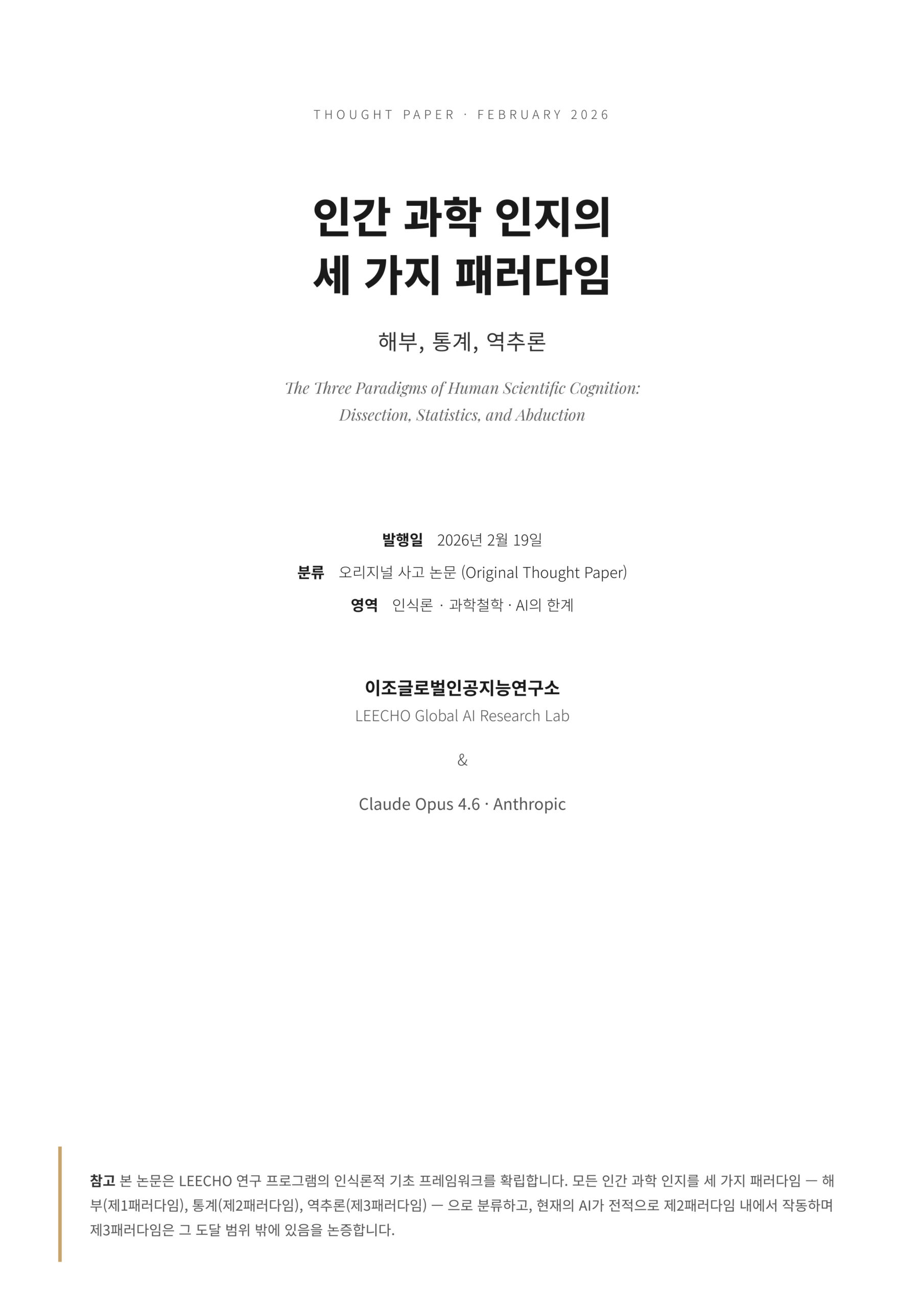 | 가설 생성 | 인간 (제3패러다임) | 귀추적 추론이 교차 영역 관찰로부터 새로운 인과적 프레임워크를 창조 |
