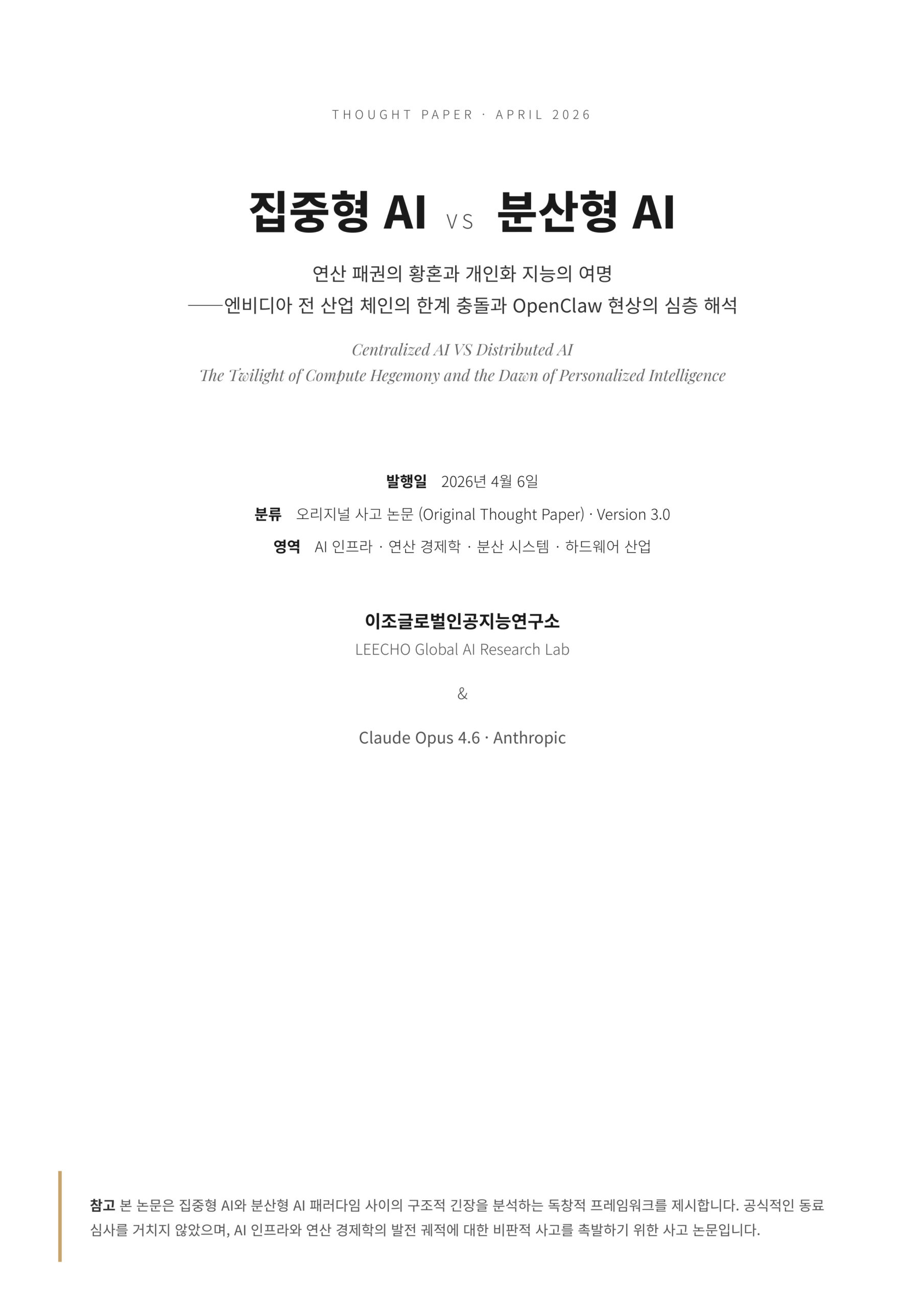 2026년, 엔비디아를 핵심으로 한 집중형 AI 산업 체인은 전방위적 물리적 한계 반발에 직면하고 있다: 전력 확장 주기가 최대 5년, 단일 칩 소비전력이 2,000W 돌파, 고다층 PCB 납기가 2026년 말까지 밀려 있고, 공동 패키지 광학(CPO)은 아직 양산되지 않았으며, 데이터센터에 50만 톤의 구리가 필요하다. 동시에 OpenClaw로 대표되는 분산형 개인화 AI는 한 달 만에 24만 이상의 GitHub Star를 획득하며, ‘로컬 에이전트 프레임워크 + 클라우드 API 호출 + 로컬 메모리’의 경로가 집중형 연산 센터의 독점을 우회할 수 있음을 증명했다. 그러나 순수 API 호출 모델은 여전히 추론 연산이 집중형 백엔드에 의존한다는 것을 의미하며——진정한 패러다임 폐쇄를 위해서는 로컬 추론 하드웨어의 합류가 필요하다. 본 논문은 산업경제학, 공급망 구조, 밸류에이션 논리, 사용자 경험의 네 가지 차원에서 집중형과 분산형 AI 패러다임의 근본적 모순을 체계적으로 분석하고, ‘DGX Spark + OpenClaw’식 로컬 연산 + 로컬 에이전트 조합을 완전한 개인 AI 주권 실현의 제3의 노선으로 제안한다.