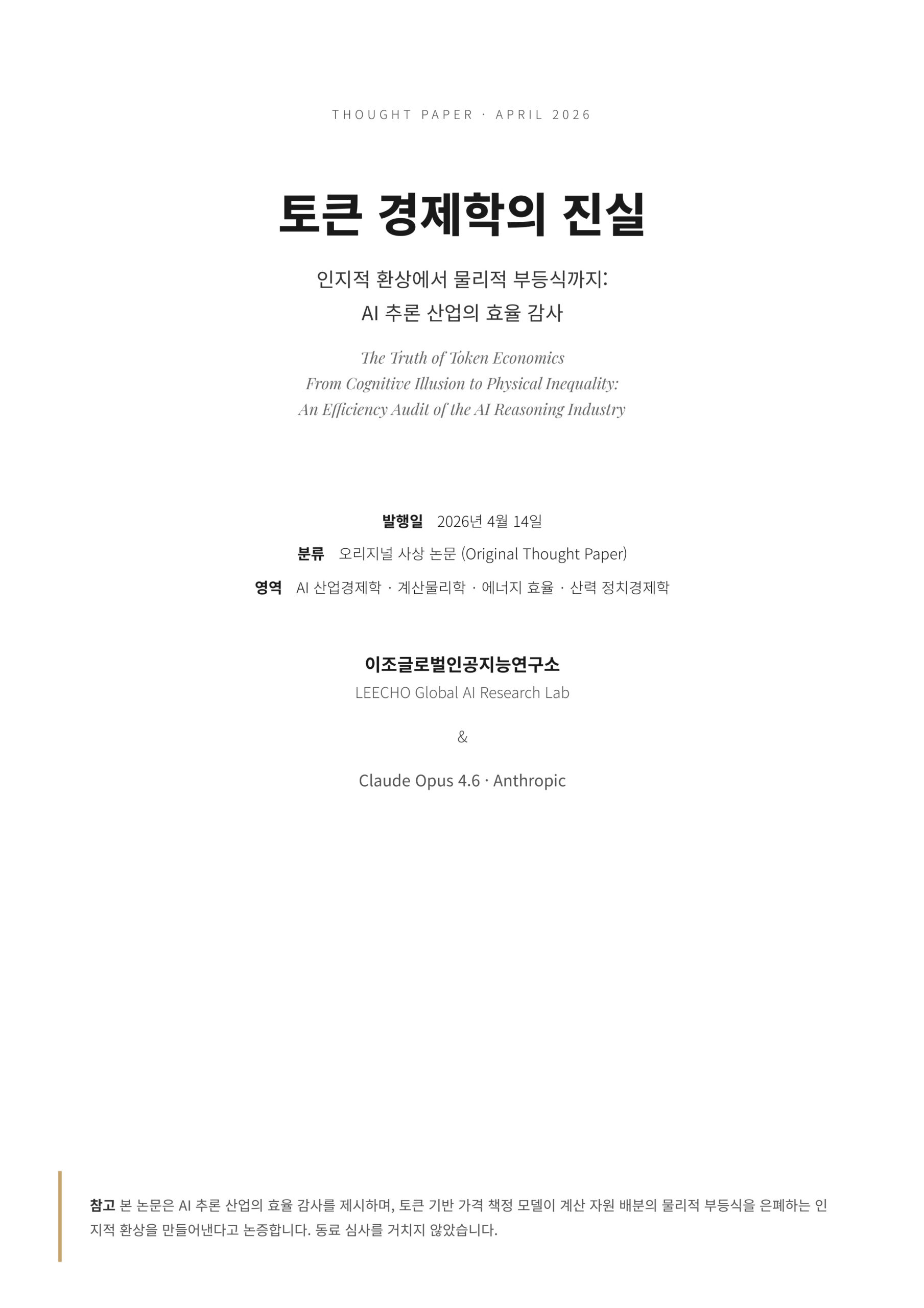 | 줄당 지능 산출 | 정확한 결과 ÷ (토큰 수 × J/token) | 물리적 차원 복원 — 진정한 지능 효율 측정 |
