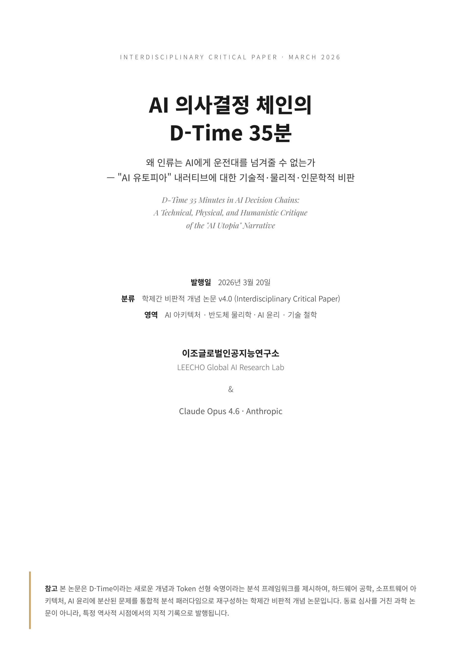본 논문은 학제간 비판적 개념 논문(Interdisciplinary Critical Conceptual Paper)으로서의 성격을 가진다. 본 논문의 학술적 기여는 다음과 같다: D-Time이라는 새로운 개념과 Token 선형 숙명이라는 분석 프레임워크를 제시함으로써, 하드웨어 공학, 소프트웨어 아키텍처, AI 윤리라는 서로 다른 학문 영역에 분산되어 있던 기존의 문제들을 하나의 통합된 분석 패러다임으로 재구성한다. 또한 “AI 유토피아”라는 마케팅 내러티브를 출발점으로 삼아, 반도체 물리학에서부터 철학적 윤리학에 이르기까지 관통하는 완전한 비판적 논증 체인을 구축한다.