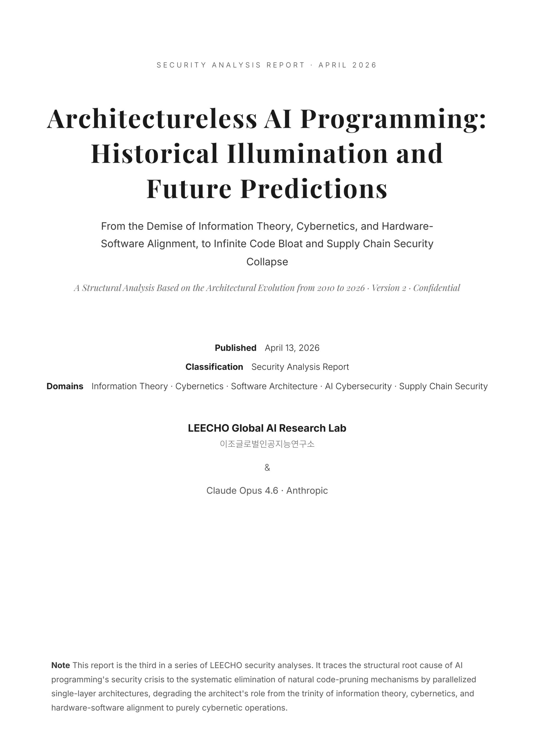 Abstract — This report is a sequel to LEECHO Global AI Research Lab’s February 2026 AI Cybersecurity Risk Analysis Report [F1] and April 2026 Root Cause Analysis of Zero-Day Bugs Discovered by Mythos [F2]. The first two papers respectively identified the clinical symptoms of “systemic collapse and accountability vacuum” and the vulnerability formation mechanism of “cross-generational knowledge lock-in leading to emergent incompatibility.” This paper traces a deeper etiology — from the perspectives of information theory [A1] and cybernetics [A2], analyzing how the evolution of software architecture from 2010 to 2026 systematically eliminated the natural pruning mechanisms for code, causing AI autonomous iteration to operate within a structural security vacuum. We argue that parallelized single-layer architecture dissolved information flow constraints, degrading the architect’s role from the trinity of “information theory + cybernetics + hardware-software alignment” to purely cybernetic operations, allowing redundancy and overflow to expand without limit simultaneously. This is not only the structural inevitability of code bloat and supply chain collapse, but also the fundamental reason why zero-day vulnerabilities have degenerated from “localized defects at cross-layer seams” to “globally unstructured diffusion.”