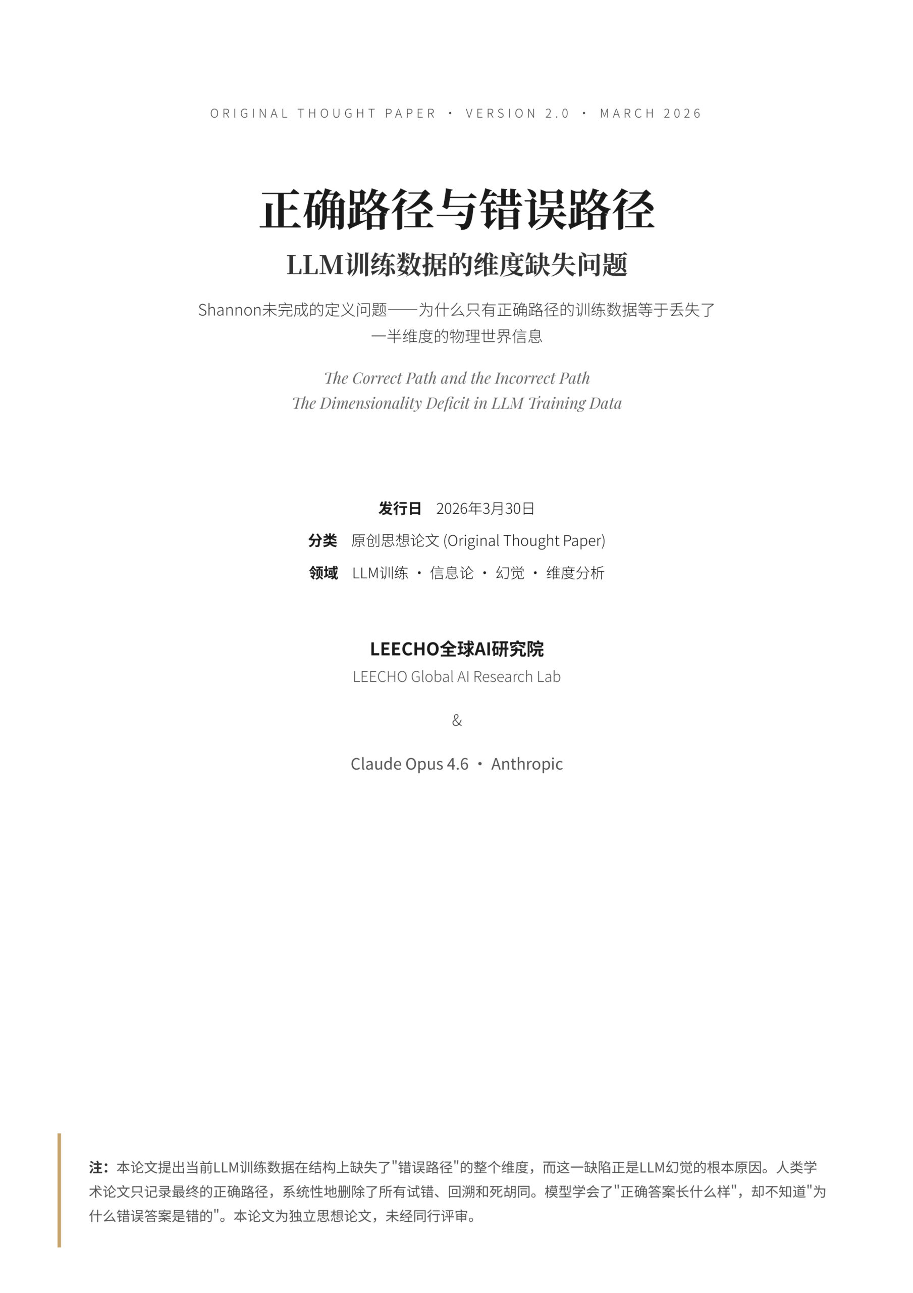 Original Thought Paper · V2 · 2026 正确路径与错误路径 LLM训练数据的维度缺失问题 Shannon未完成的定义问题——为什么只有正确路径的训练数据 等于丢失了一半维度的物理世界信息 LEECHO Global AI Research Lab · 이조글로벌인공지능…