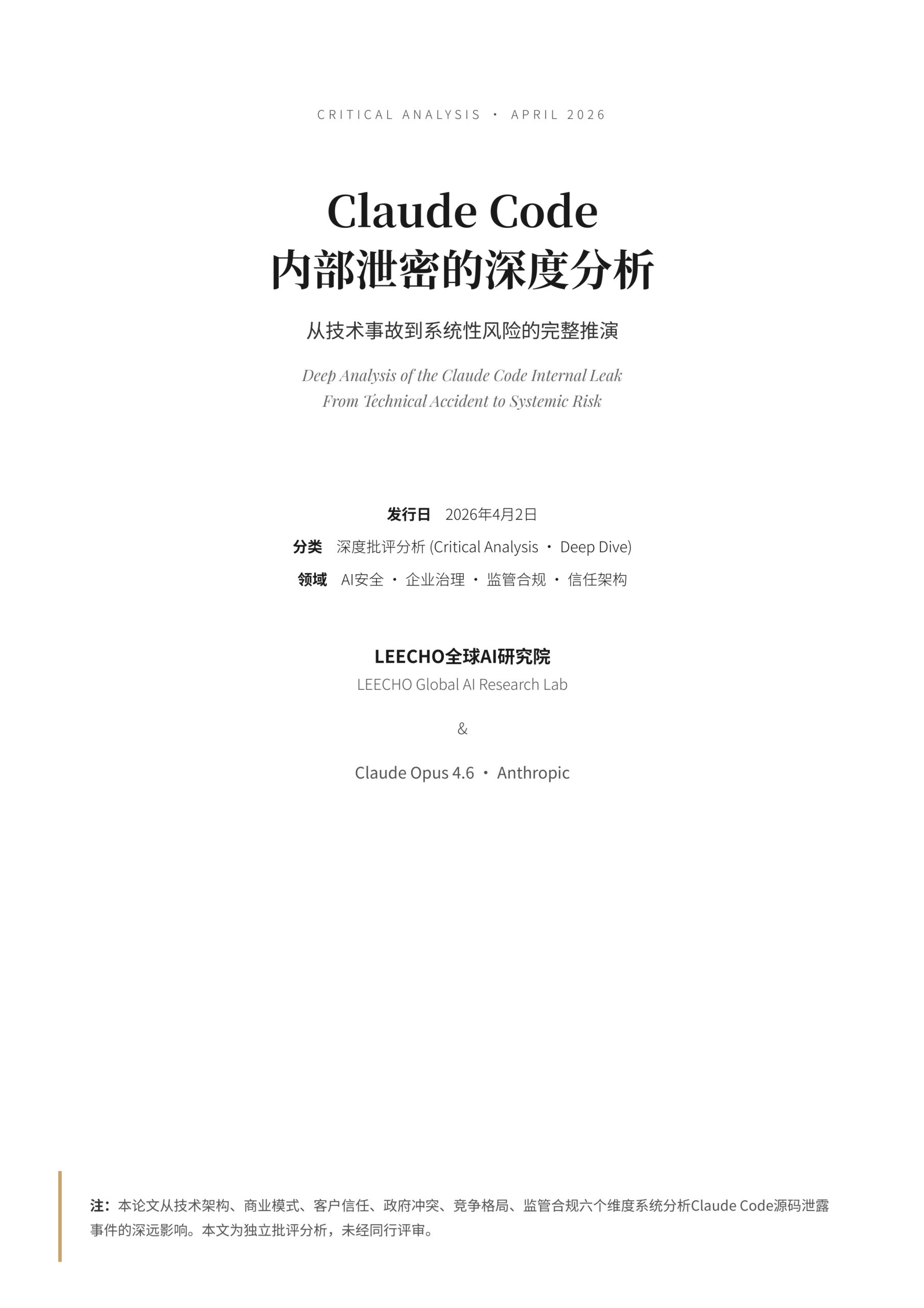 ⚠ CRITICAL ANALYSIS · 深度分析 Claude Code 内部泄密的深度分析 一次构建工具的配置失误如何引爆品牌信任崩塌、监管风暴、政治博弈与商业存亡的全面危机——从技术事故到系统性风险的完整推演 이조글로벌인공지능연구소 LEECHO Global AI Research La…