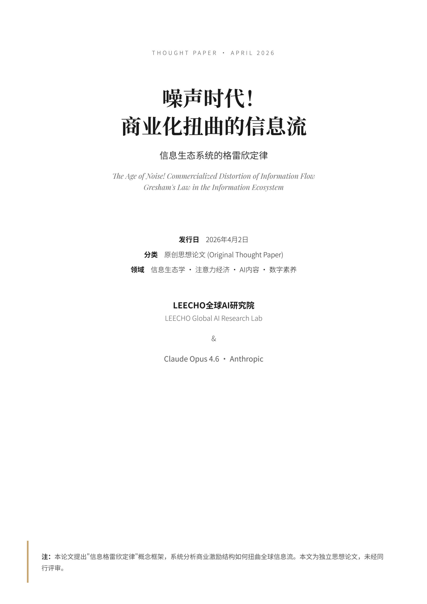 이조글로벌인공지능연구소 (LEECHO Global AI Research Lab) & Opus 4.6 · Thought Paper 噪声时代!商业化扭曲的信息流 当SEO排名取代真相排名,当AI Slop淹没人类洞察,当注意力经济奖励噪声而非信号——我们正经历信息生态系统的格雷欣…