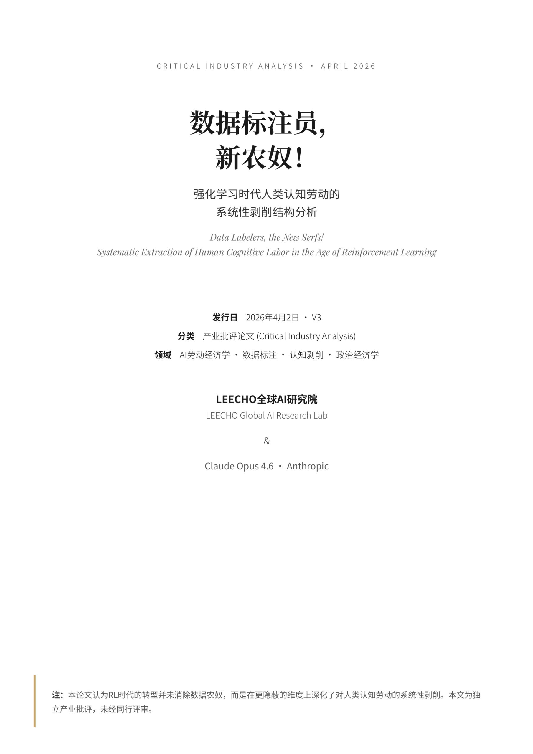 产业批评论文 · Critical Industry Analysis 数据标注员,新农奴! 从RLHF到RLVR,从肯尼亚标注工厂到硅谷奖励函数—— AI产业用更精确的方法,在更隐蔽的维度上,系统性提取人类认知劳动的剩余价值 V3 · 2026.04.02 | 이조글로벌인공지능연구소 · LEE…