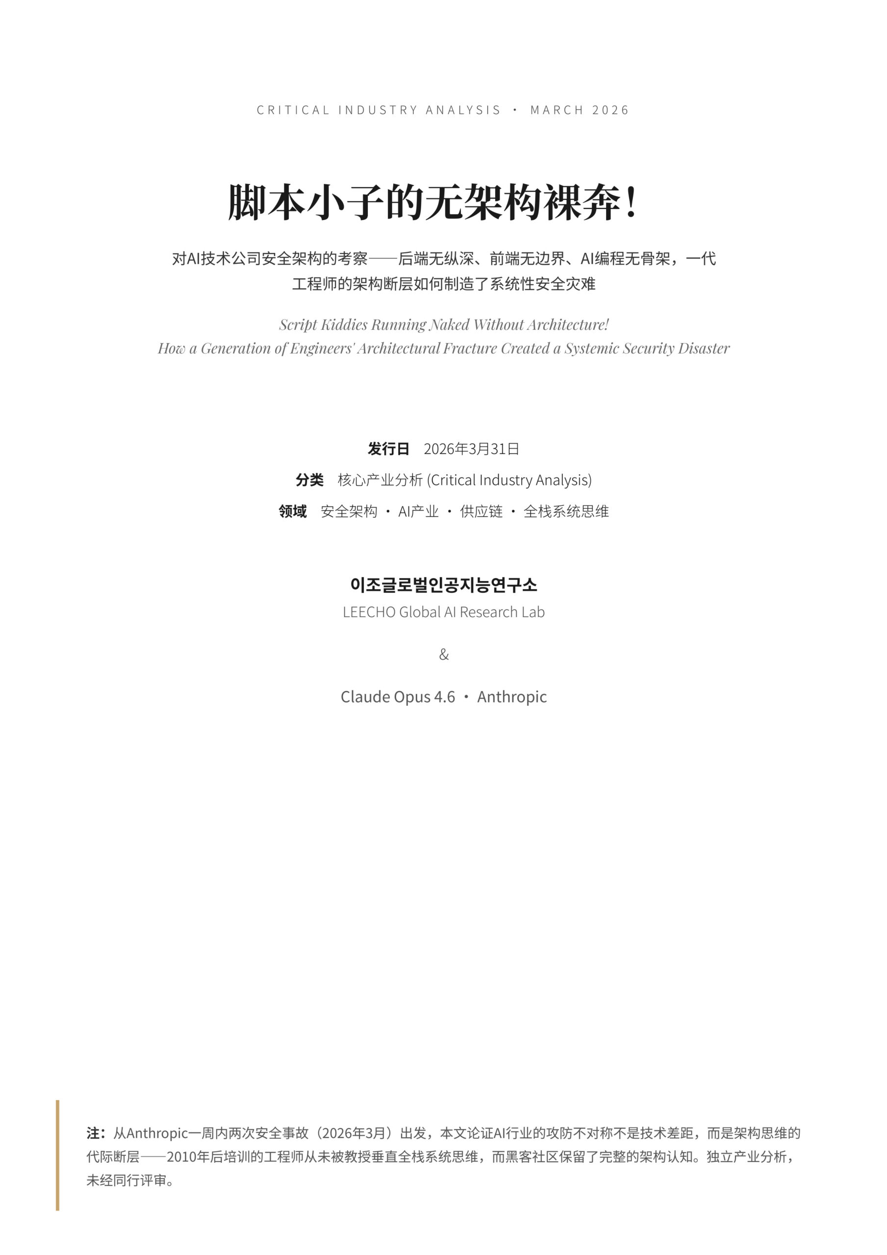 产业批评论文 · Critical Industry Analysis 脚本小子的无架构裸奔! 对AI技术公司安全架构的考察——后端无纵深、前端无边界、AI编程无骨架,一代工程师的架构断层如何制造了系统性安全灾难 V1 · 2026年3月31日 李朝世界人工智能研究所 · LEECHO Global…