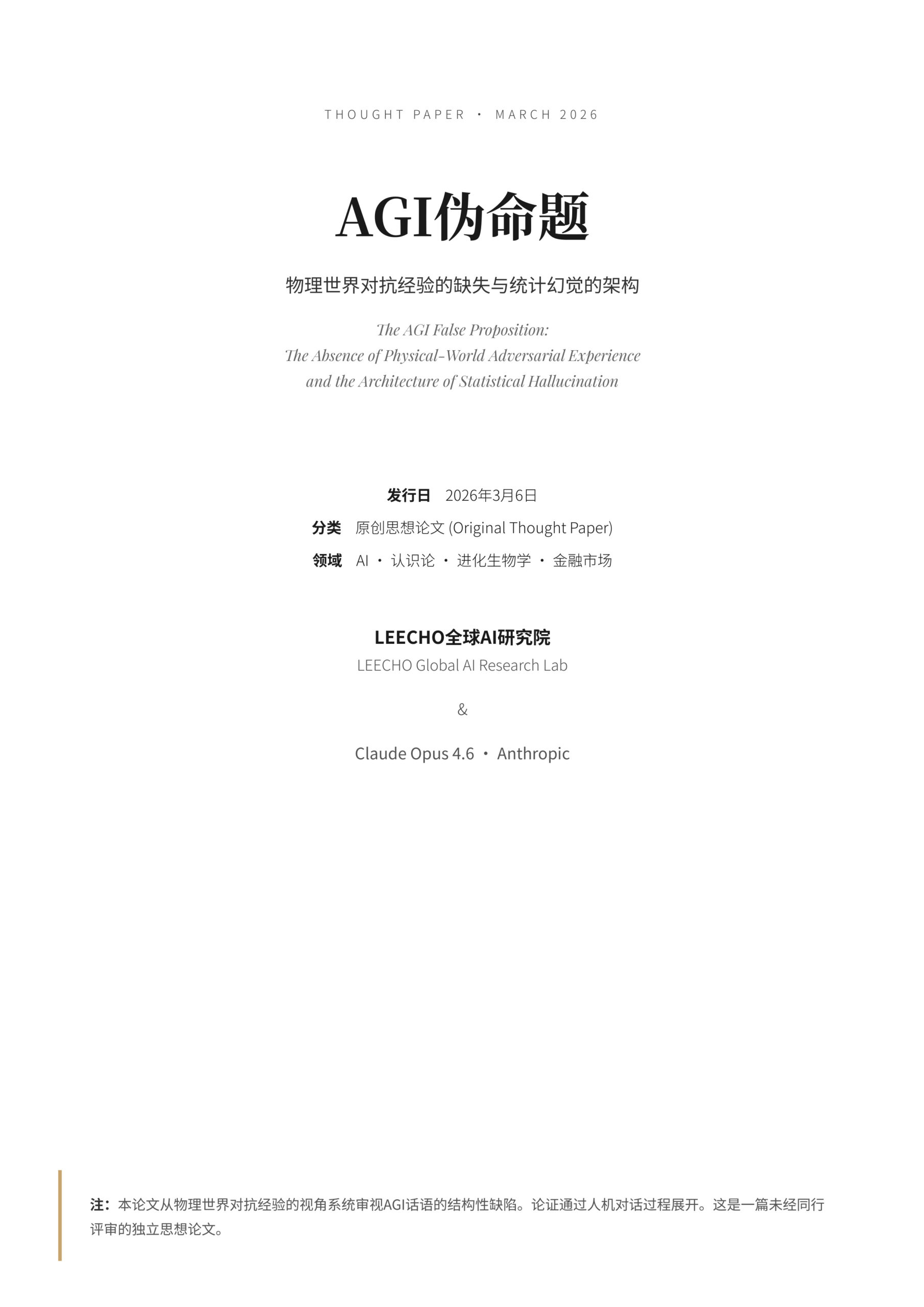 Thought Paper · March 2026 AGI伪命题物理世界对抗经验的缺失与统计幻觉的架构 “从深井底部仰望的人 相信那个小圆圈就是天空的全部 宣称他们将用一滴井水重建大洋。 这就是AGI时代的时代精神。” 发行日 2026年3月6日 分类 原创思考论文 (Or…