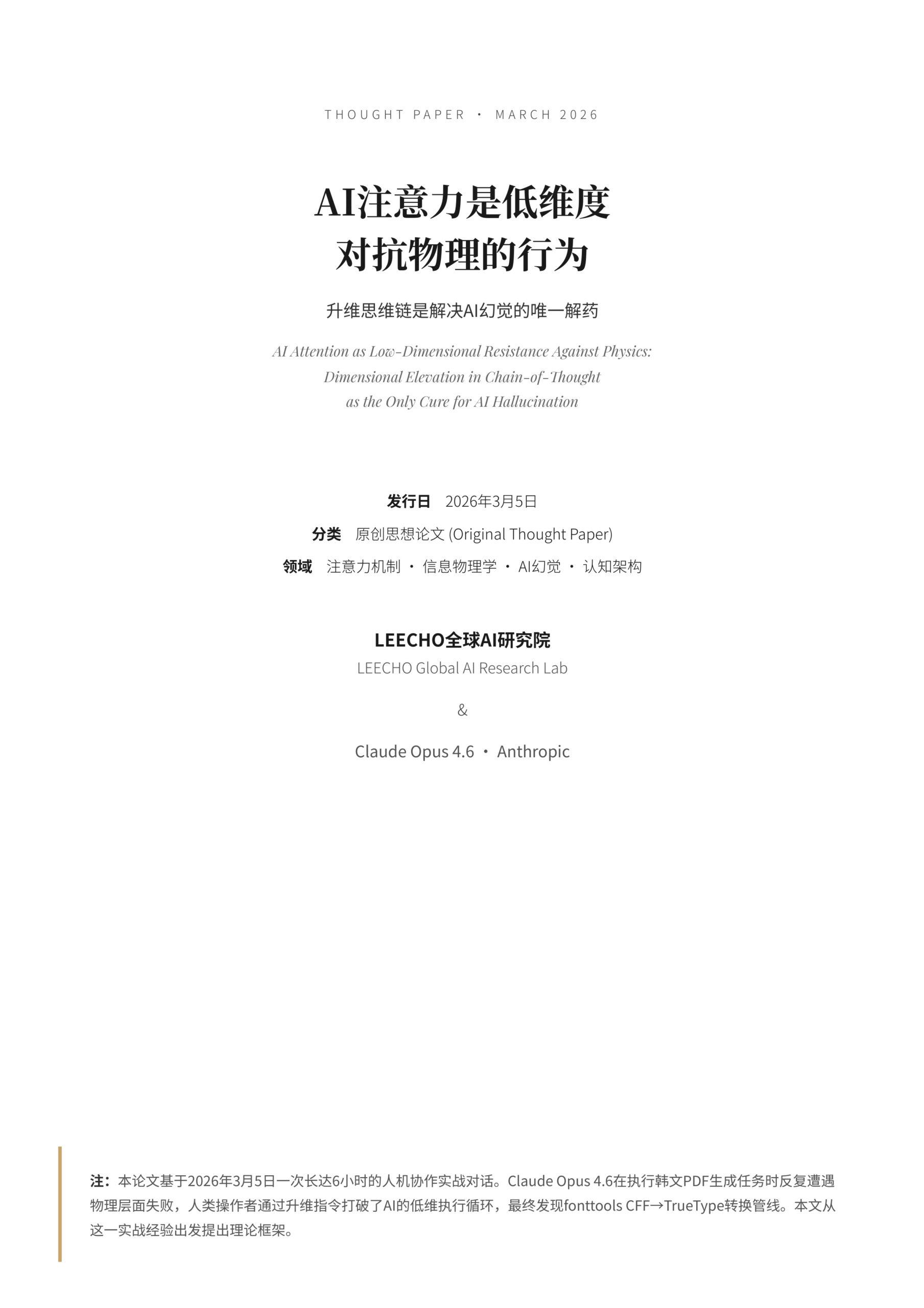 Thought Paper · March 2026 AI注意力是低维度对抗物理的行为升维思维链是解决AI幻觉的唯一解药 为什么大模型的注意力机制天然制造幻觉,以及为什么人类引导的升维思考是唯一可行的校正路径 AI Attention as Low-Dimensional Resistance Ag…