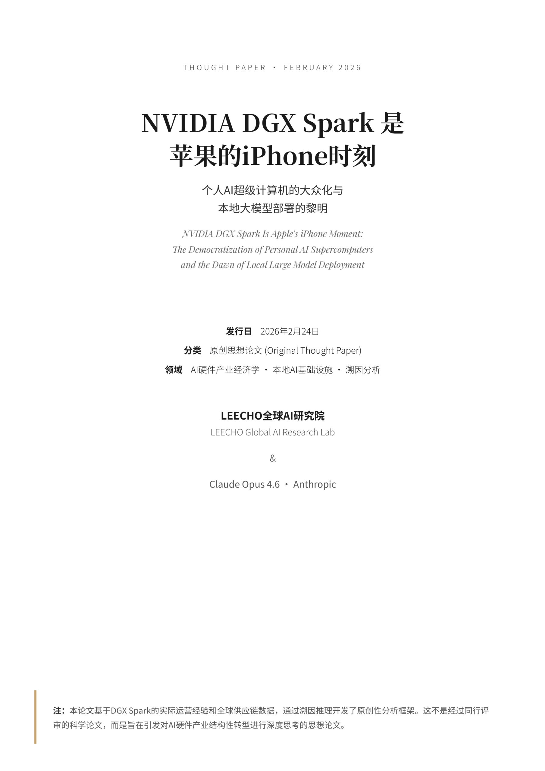 Thought Paper · February 2026 NVIDIA DGX Spark 是苹果的iPhone时刻 个人AI超级计算机的大众化与本地大模型部署的黎明 The Democratization of Personal AI Supercomputersand the Dawn of …