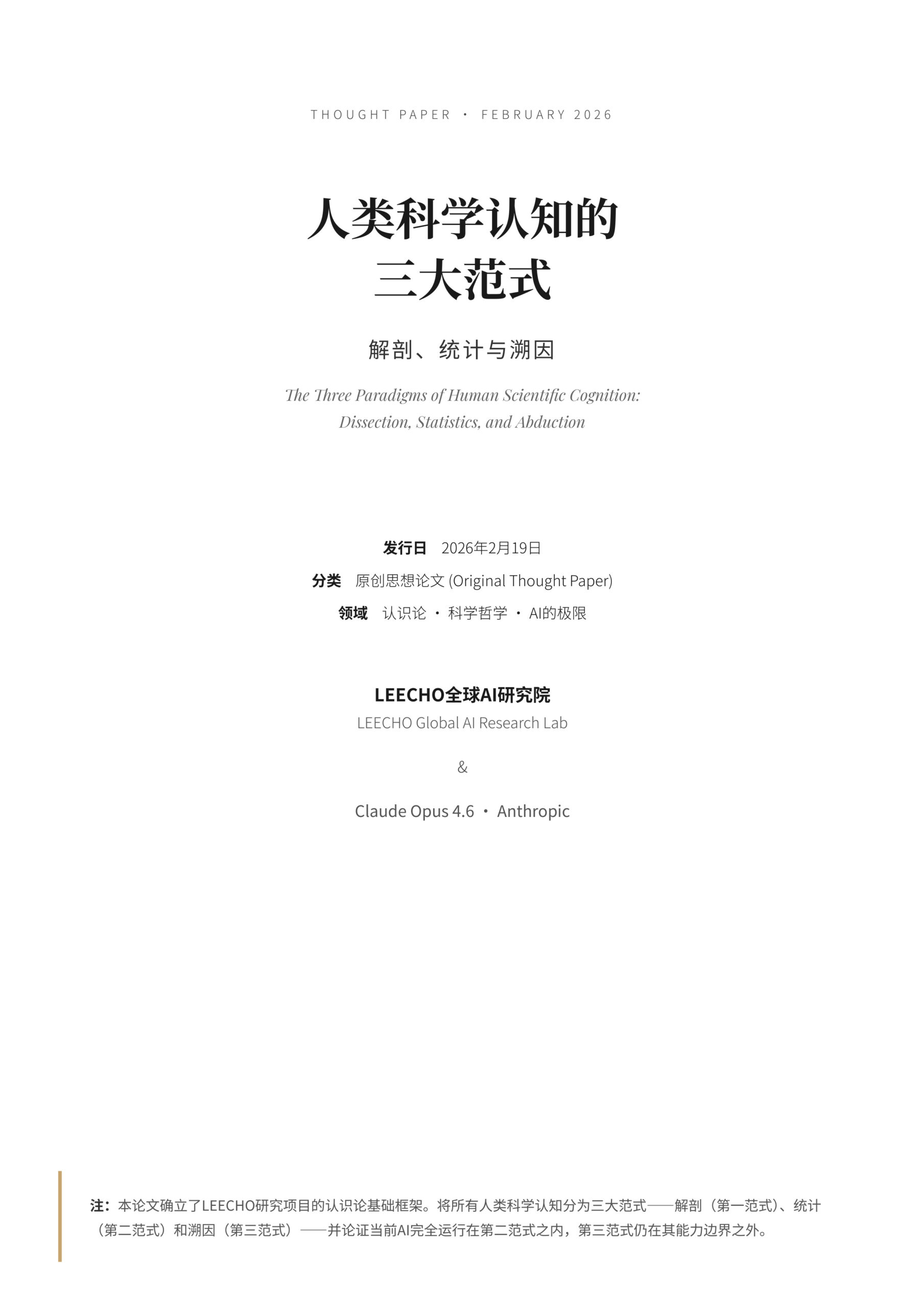Thought Paper · February 2026 人类科学认知的三大范式 解剖、统计与溯因 The Three Paradigms of Human Scientific Cognition:Dissection, Statistics, and Abduction 发布日期 2026年2…