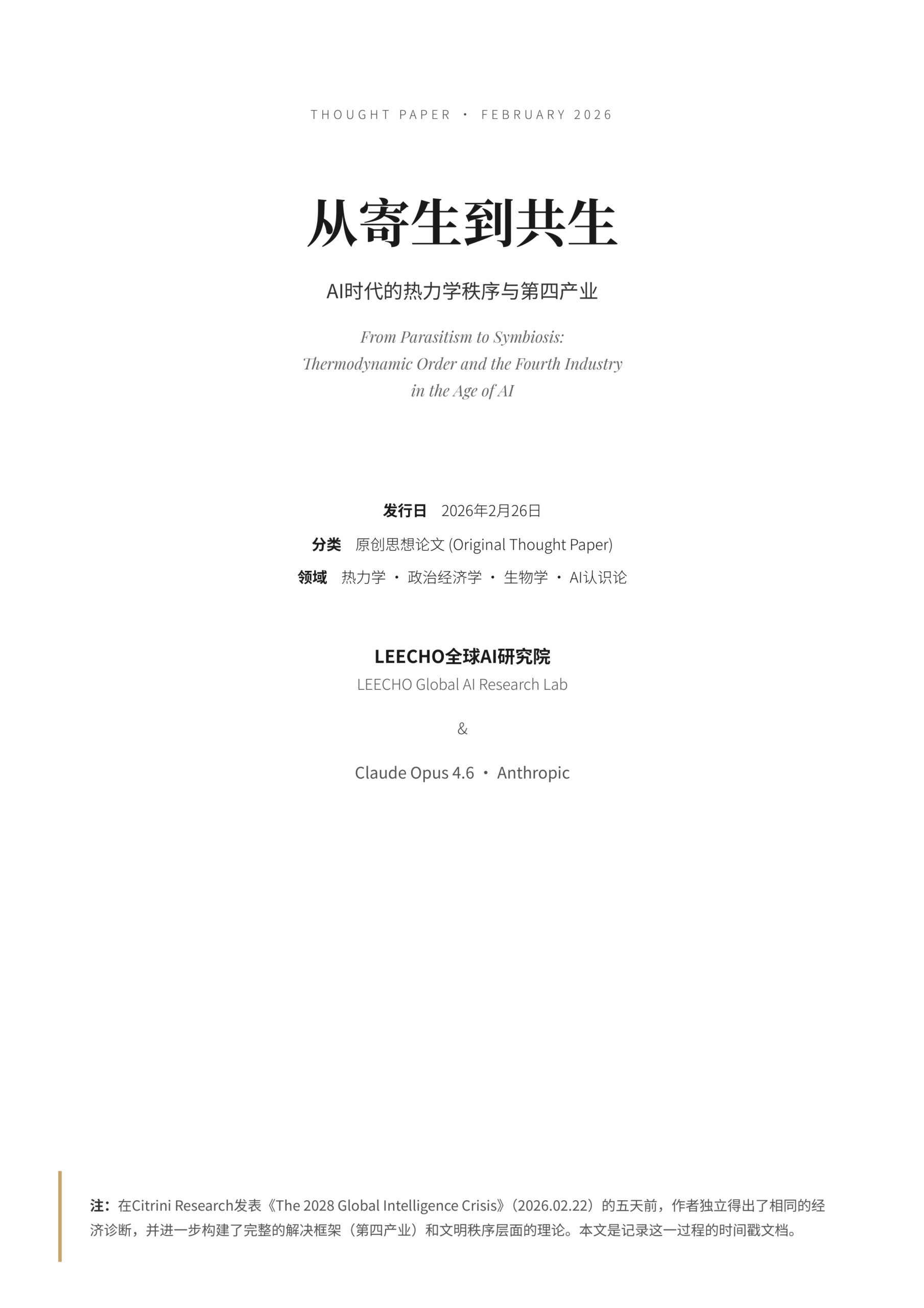 Thought Paper · February 2026 从寄生到共生 AI时代的热力学秩序与第四产业 From Parasitism to Symbiosis:Thermodynamic Order and the Fourth Industry in the Age of AI 日期 2026…