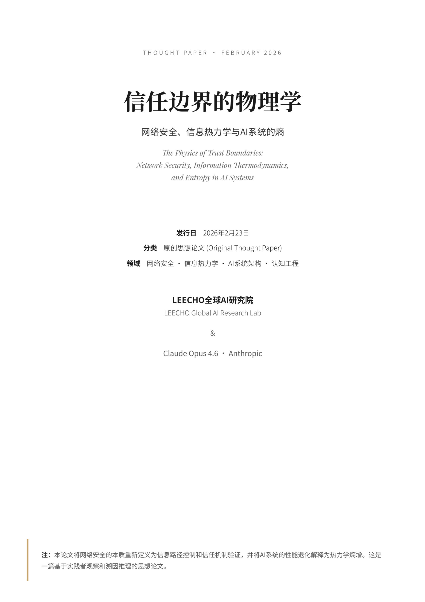 Thought Paper · February 2026 信任边界的物理学 网络安全、信息热力学与AI系统的熵 The Physics of Trust Boundaries:Network Security, Information Thermodynamics, and Entropy in …