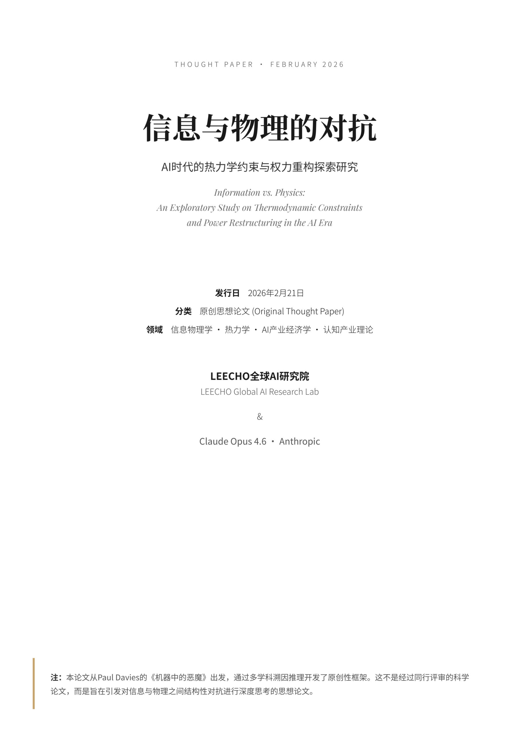 Thought Paper · February 2026 信息与物理的对抗 AI时代的热力学约束与权力重构探索研究 Information vs. Physics: An Exploratory Study on Thermodynamic Constraintsand Power Restruc…
