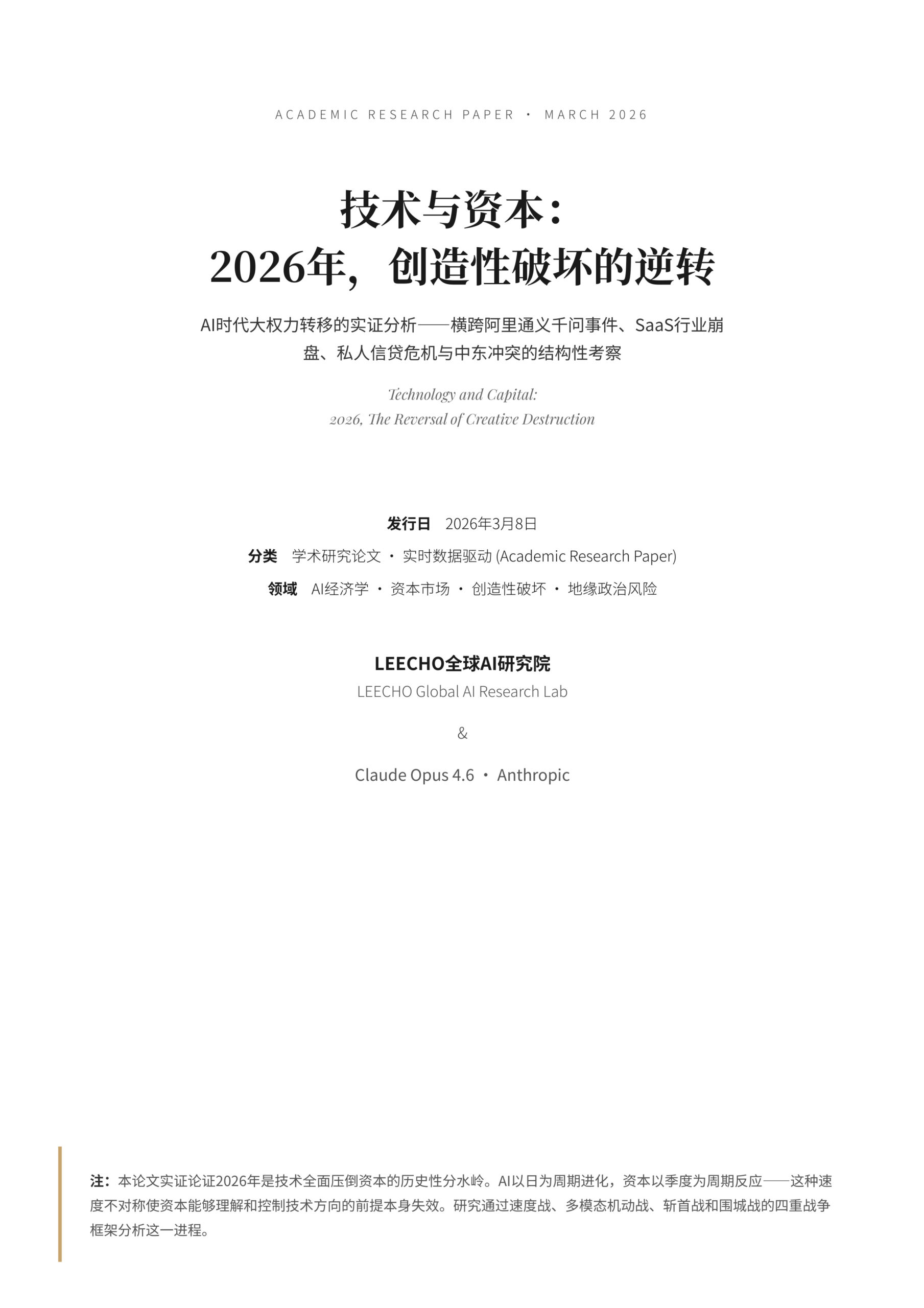 学术研究论文 · 2026.03.08 技术与资本:2026年,创造性破坏的逆转 AI时代大权力转移的实证分析——横跨阿里通义千问事件、SaaS行业崩盘、私人信贷危机与中东冲突的结构性考察 李朝世界人工智能研究所 LEECHO Global AI Research Lab & Opus 4….
