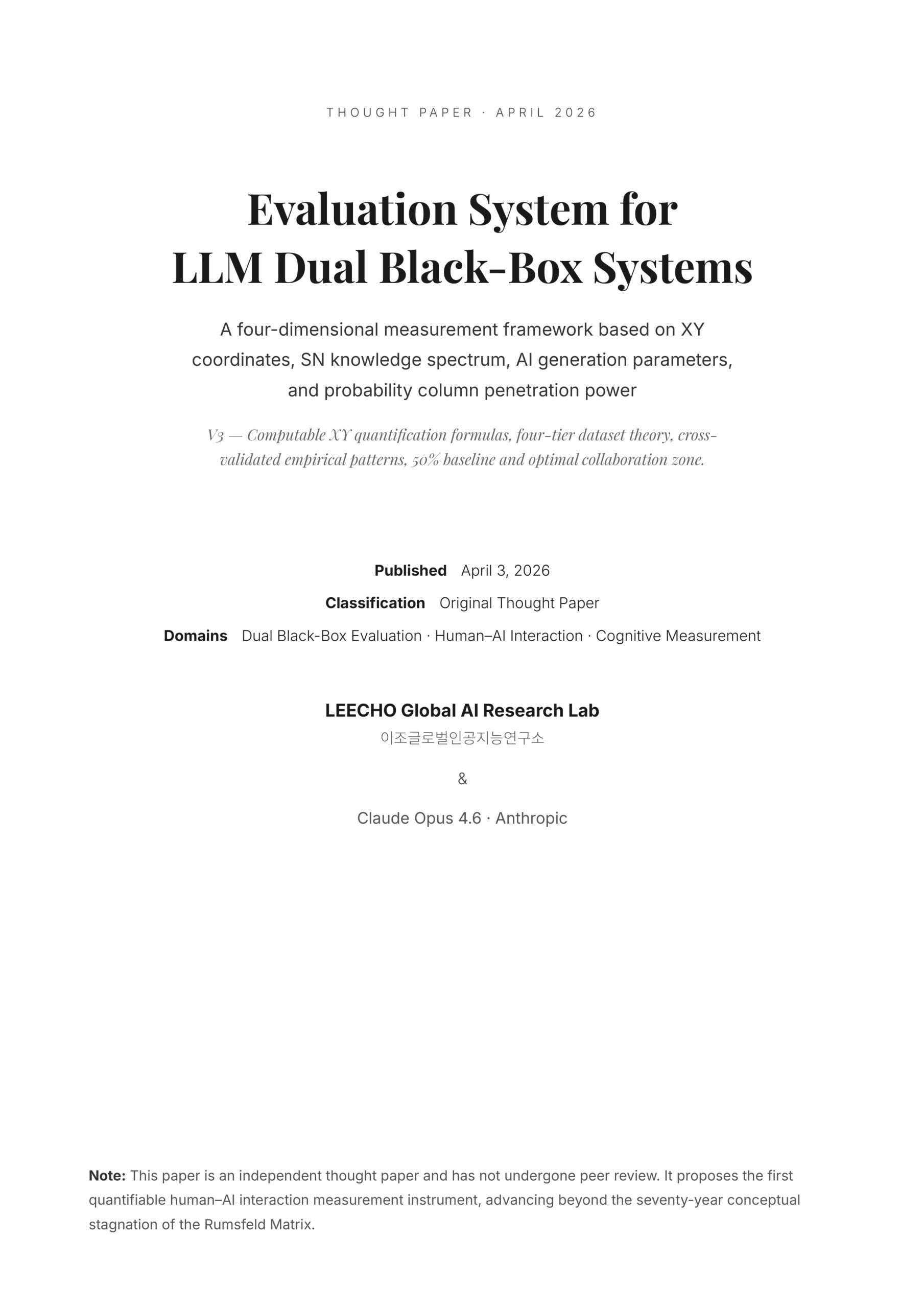 Thought Paper · Dual Black-Box Evaluation V3 · 2026.04.03 Evaluation System forLLM Dual Black-Box Systems A four-dimensional measurement framework bas…