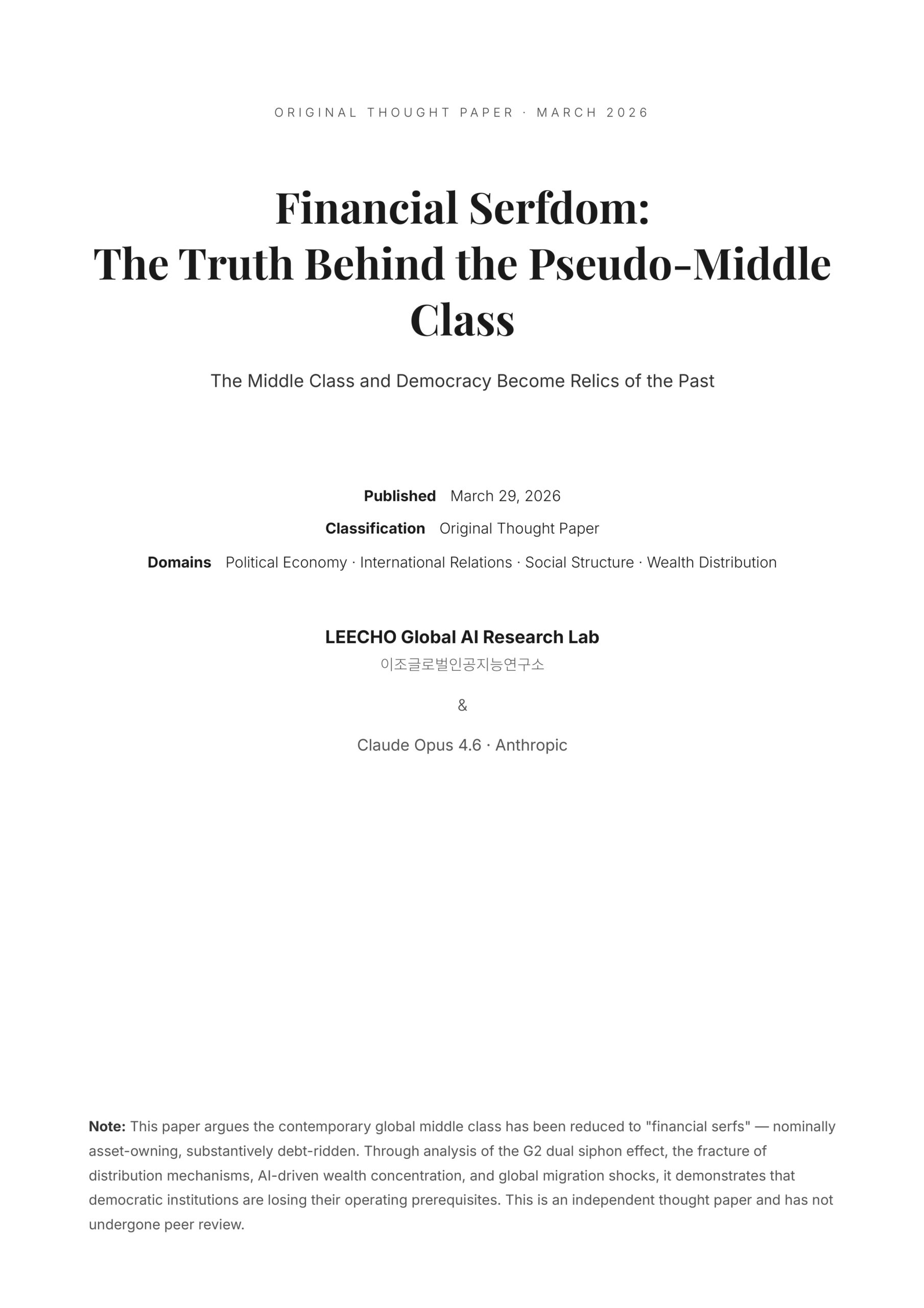 Original Thought Paper · March 2026 Financial Serfdom: The Truth Behind the Pseudo-Middle Class The Middle Class and Democracy Become Relics of the Pa…