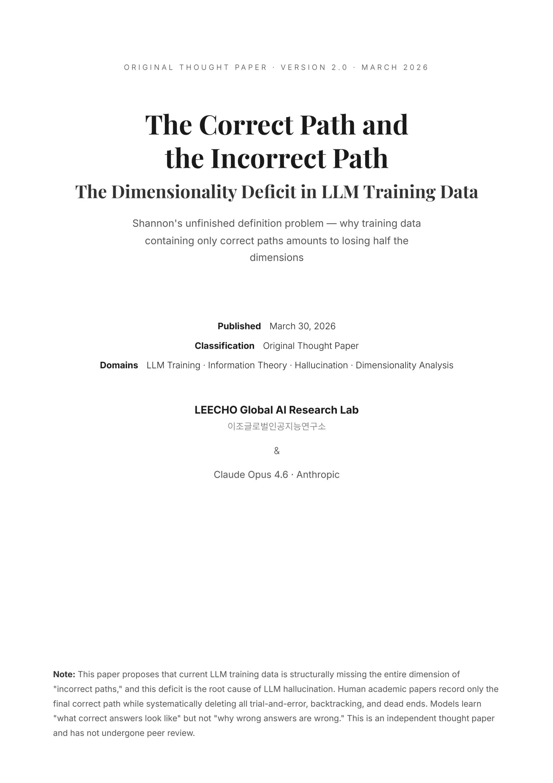 Original Thought Paper · V2 · 2026 The Correct Path and the Incorrect Path The Dimensionality Deficit in LLM Training Data Shannon’s unfinished …