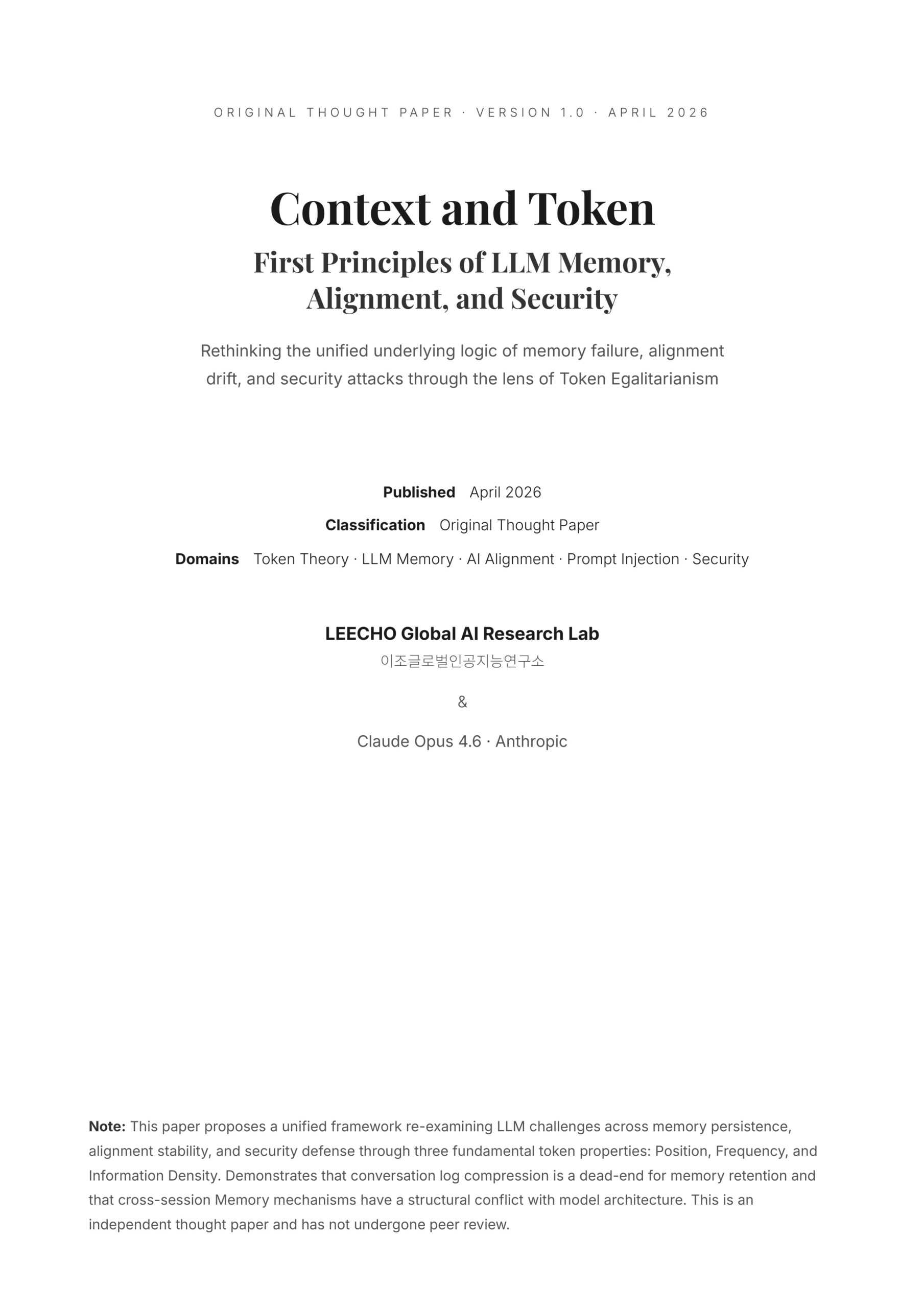 LEECHO · Thought Paper Context and Token First Principles of LLM Memory, Alignment, and Security Rethinking the unified underlying logic of memory fai…
