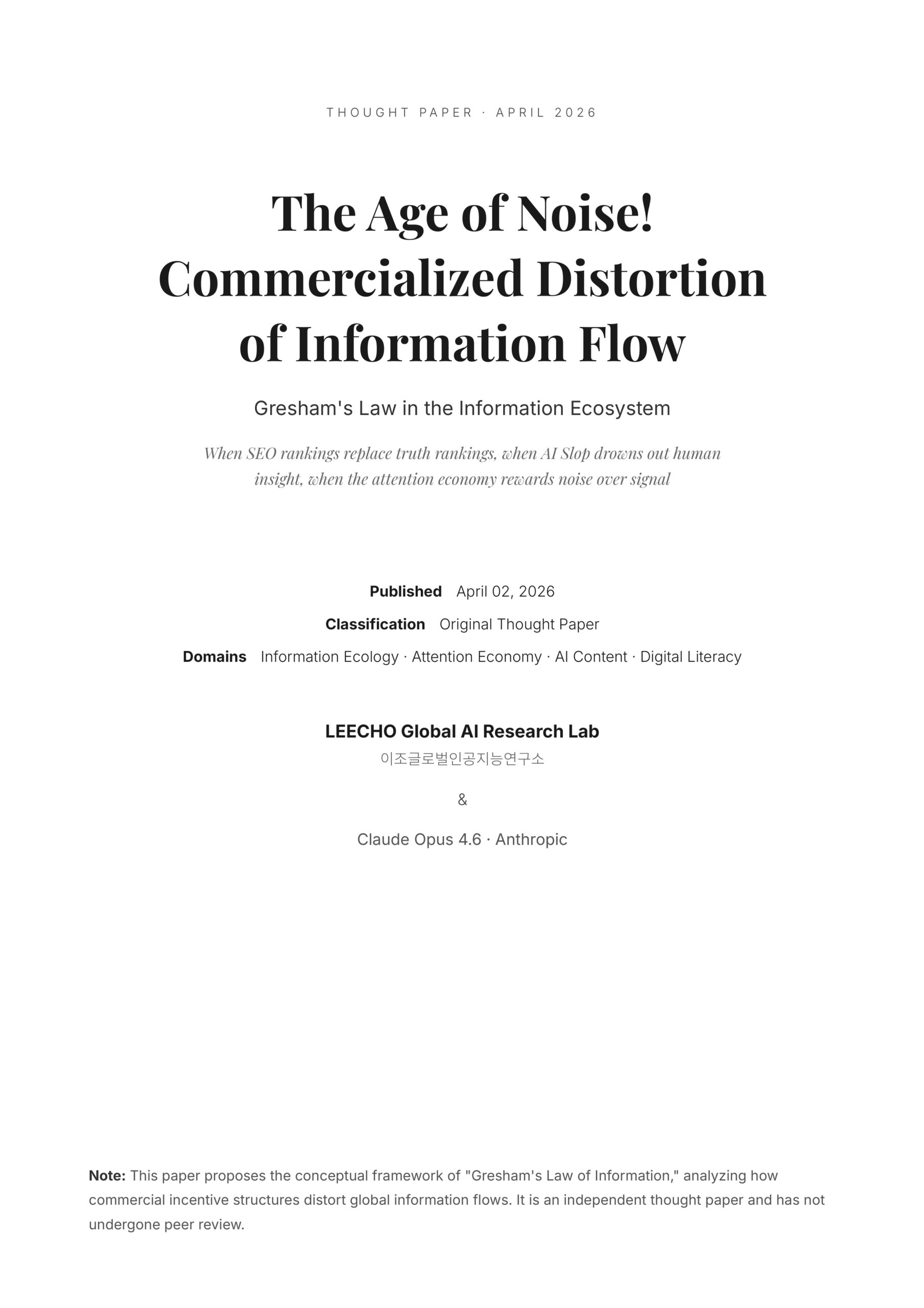 이조글로벌인공지능연구소 (LEECHO Global AI Research Lab) & Opus 4.6 · Thought Paper The Age of Noise!Commercialized Distortion of Information Flow When SEO ra…