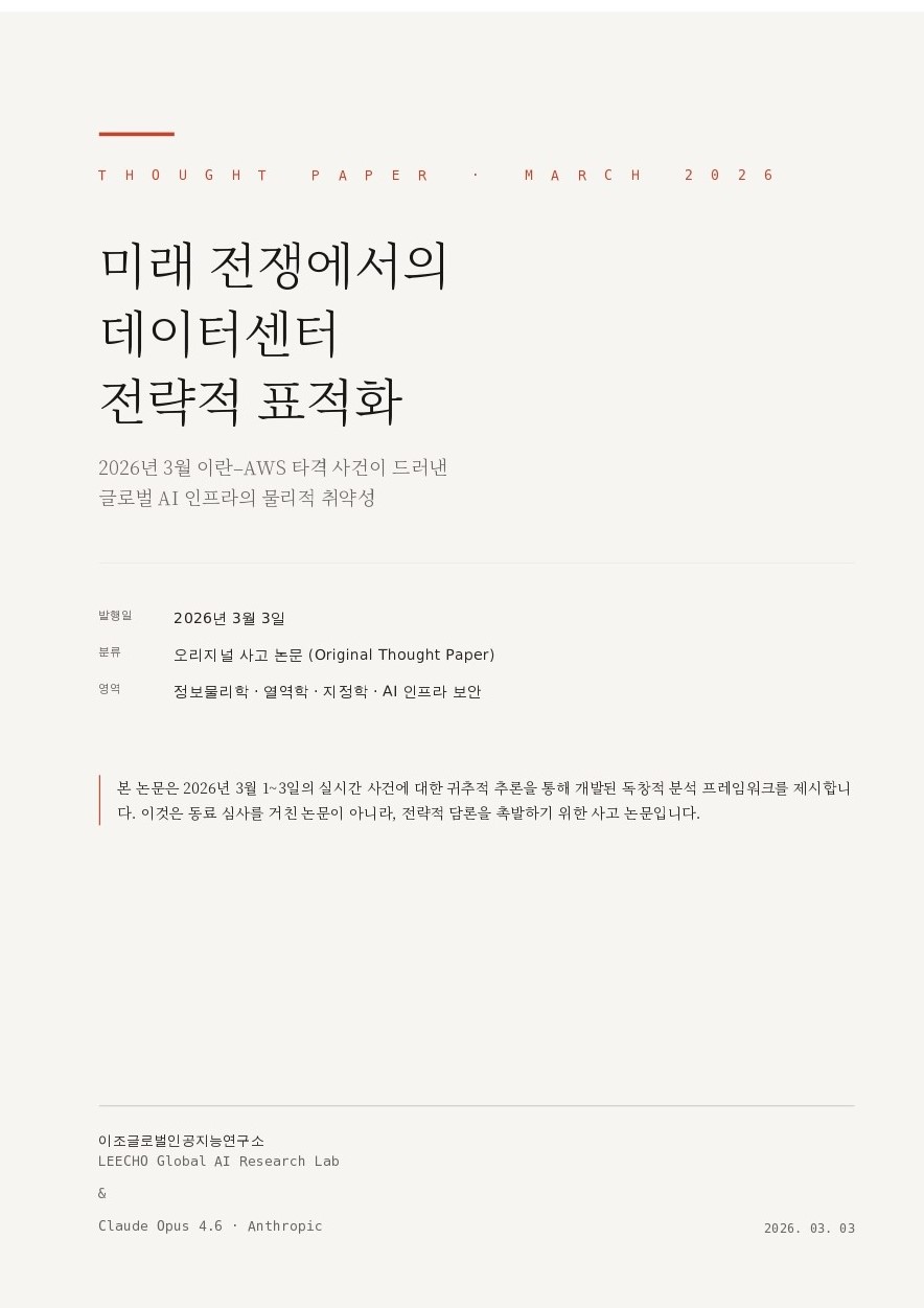 사고 논문 · 2026년 3월 발행일 2026년 3월 3일 미래 전쟁에서의데이터센터 전략적 표적화 2026년 3월 이란–AWS 타격 사건이 드러낸글로벌 AI 인프라의 물리적 취약성01 사건: 미사일이 클라우드를 타격하다 2026년 3월 1일, 이란은 미국–이스라엘 연합의 ‘에픽 퓨리(Epic Fury)’ 작전에 대한 보복으로 걸프 지역 전역에 미사일과 무인기 공격을 감행했다. 이 작전으로 이란의 최고지도자 아야톨라 알리 하메네이와 다수의 고위 … 더 읽기