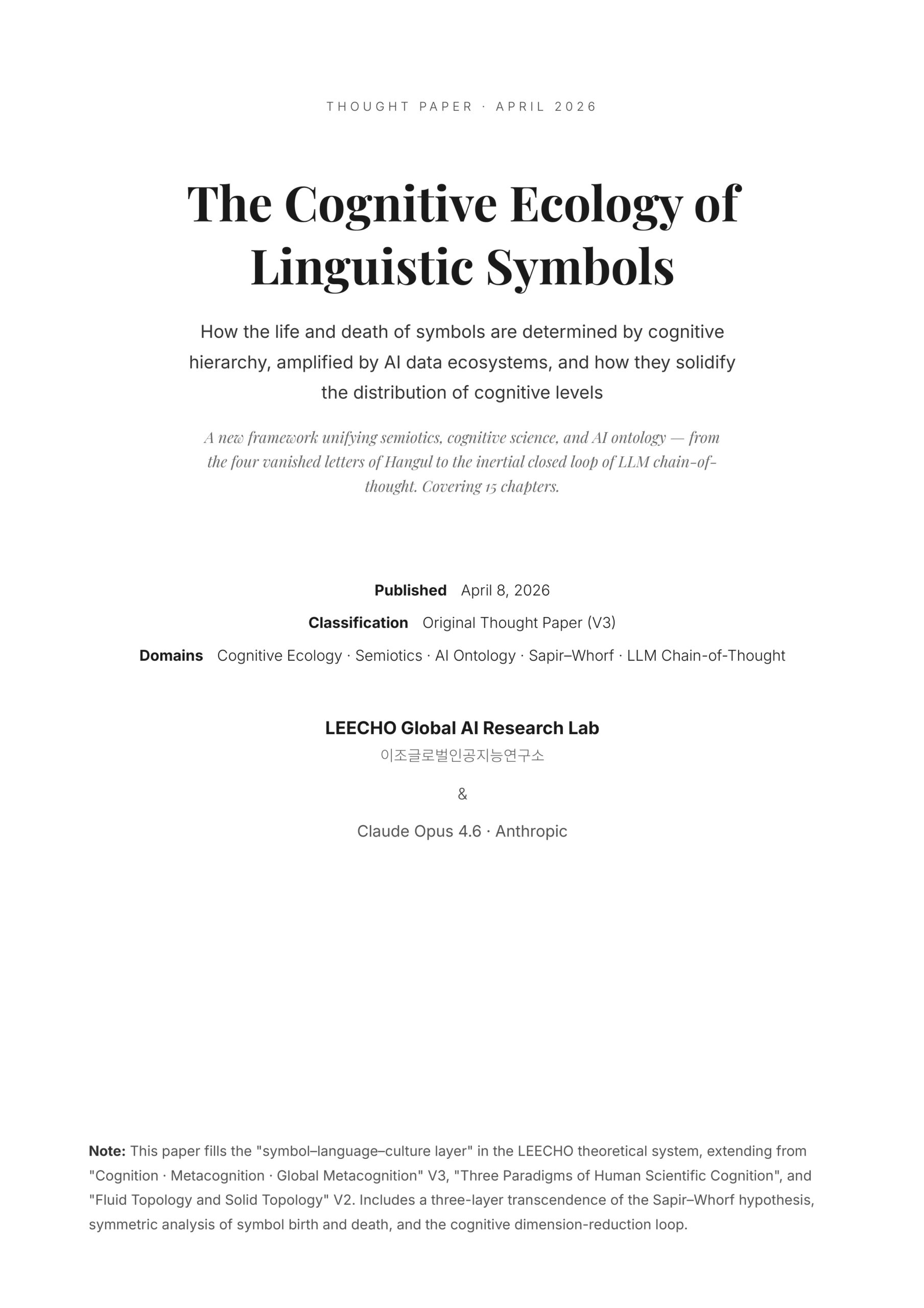 This paper fills the “symbol–language–culture layer” gap in the existing LEECHO Research Lab theoretical system: “Cognition · Metacognition · Global Metacognition” V3 provides the hierarchical theory at the cognitive-structural level, “Three Paradigms of Human Scientific Cognition” provides the methodological framework, and “Fluid Topology and Solid Topology” V2 provides the physical-constraint argument. As the fourth paper, this one connects the missing link among the previous three — how the life-and-death dynamics of linguistic symbol systems participate in the formation of the cognitive solidification loop.